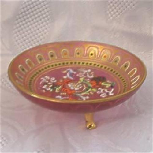 Moser cranberry footed dish, 3" wide decorated with a polychrome design of acanthus scrolling and peacock eyes, with three applied feet, made in Austria, 1858-1924. Excelent Condition.