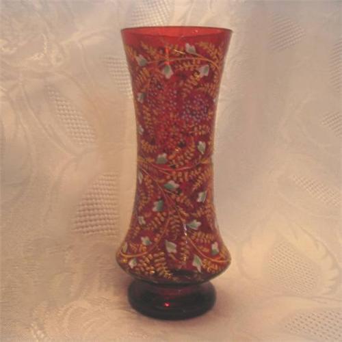 Moser footed red vase with enamel decoration. 1858-1924. Excelent condition.