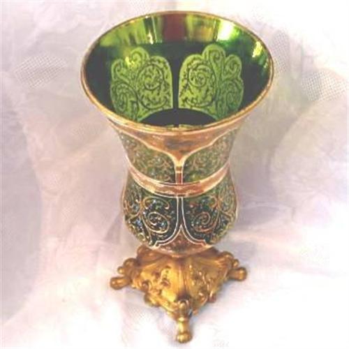 Moser glass and metal footed compote, translucent green glass with church-like window panes, deocrated with gold scrolling and blue flowers, gilt rim and foot, accented with silver band of foliage, gold embossed stand, 11 1/2" tall, Made in Austria, 1858-1924. Excelent Condition.