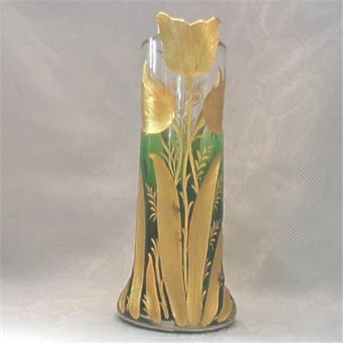 Moser intaglio cut 9" vase,green to clear with gold filled tulips. Mint.