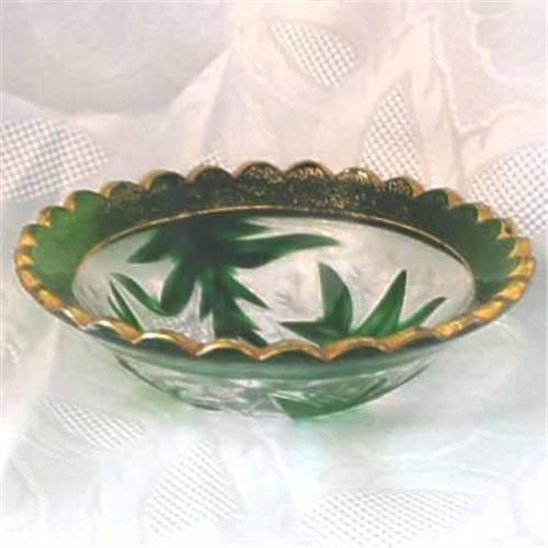 Moser marquetry bowl, green intaglio cut flowers on crystal bowl with green ruffled rim trimmed in gold, 6 1/4" wide, Made in Austria, 1858-1924. Excelent Condition.