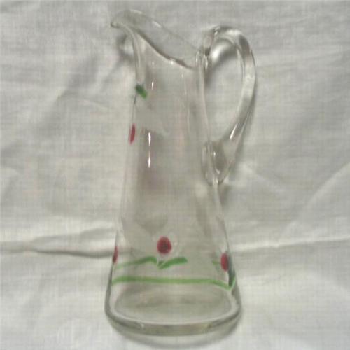 Moser marquetry pitcher, clear pitcher with marquetry red cherries and green branches on intaglio cut stemmed leaves, 10" tall. Excelent condition. 1858-1924.