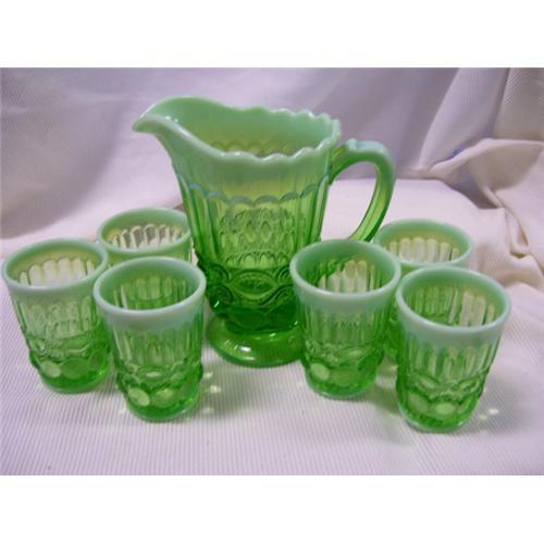 Moser Opalescent Green Pitcher and 6 Glasses, has no chips or cracks!