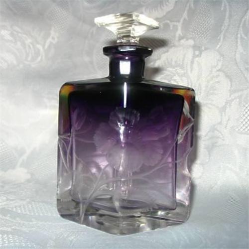 Moser perfume with stopper, diamond shape, intaglio cut, amethyst to clear. 4 1/4" tall. Mint condition.