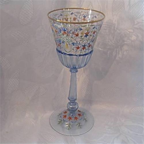 Moser decorated Venetian Goblet,ribbed pillar stemmed light blue goblets decorated with polychrome scrolling 9" tall, made in Austria, 1858-1924. Excelent Condition.