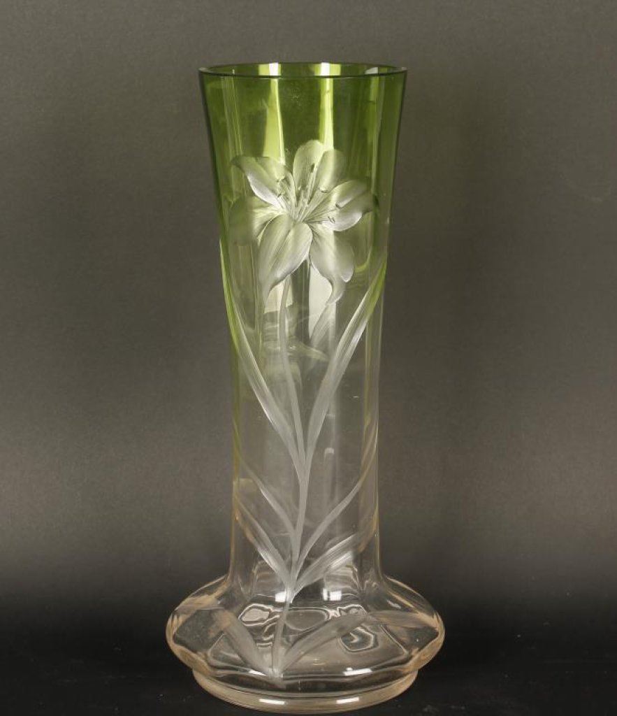 Moser glass vase circa 1900 in clear to emerald green showing intaglio cut in floral pattern. Est.: $400-$800