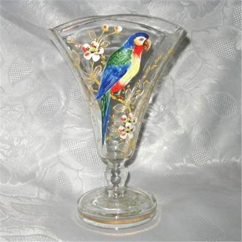 Moser Type Crystal vase with hand enameled parrot and floral decoration. CA. 1890. Excelent condition.
