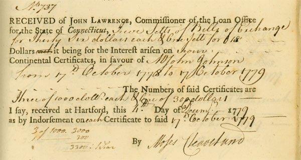 (1754-1806) Lawyer, politician, soldier and surveyor from Connecticut. While surveying the Western Reserve in 1796, Cleaveland founded the city of Cleveland, Ohio. Partially Printed Document Signed, “Moses Cleaveland.” One page, 7 1/4” x3 7/8”. Hartford. December 4, 1779. The document acknowledges the receipt of Bills of Exchange for the interest on Continental Certificates held by John Johnson. Very Fine.