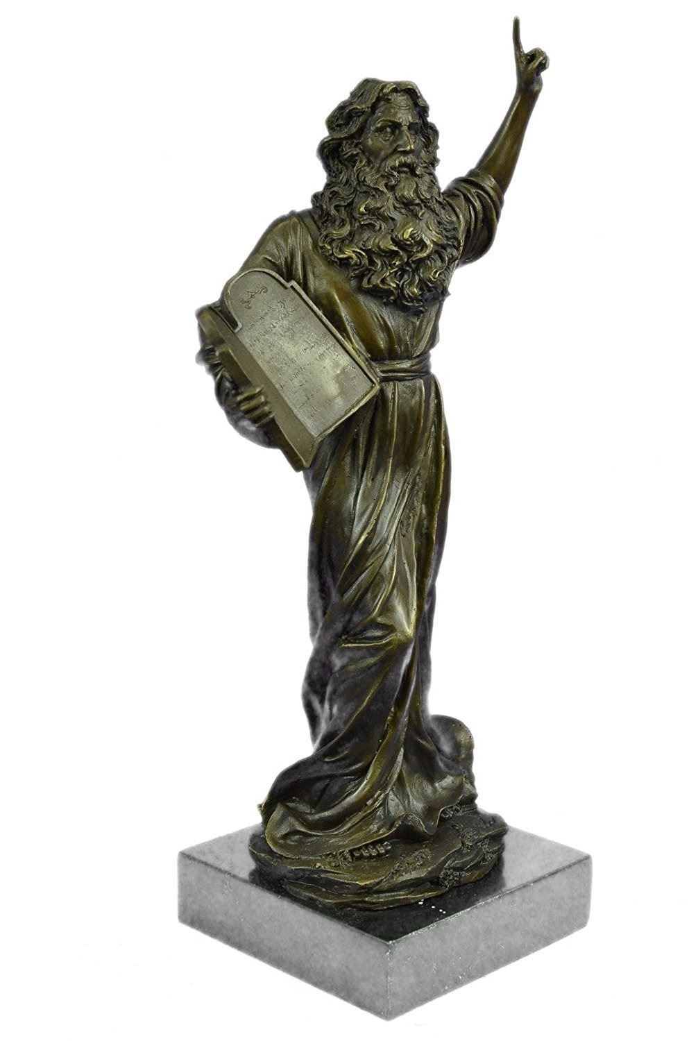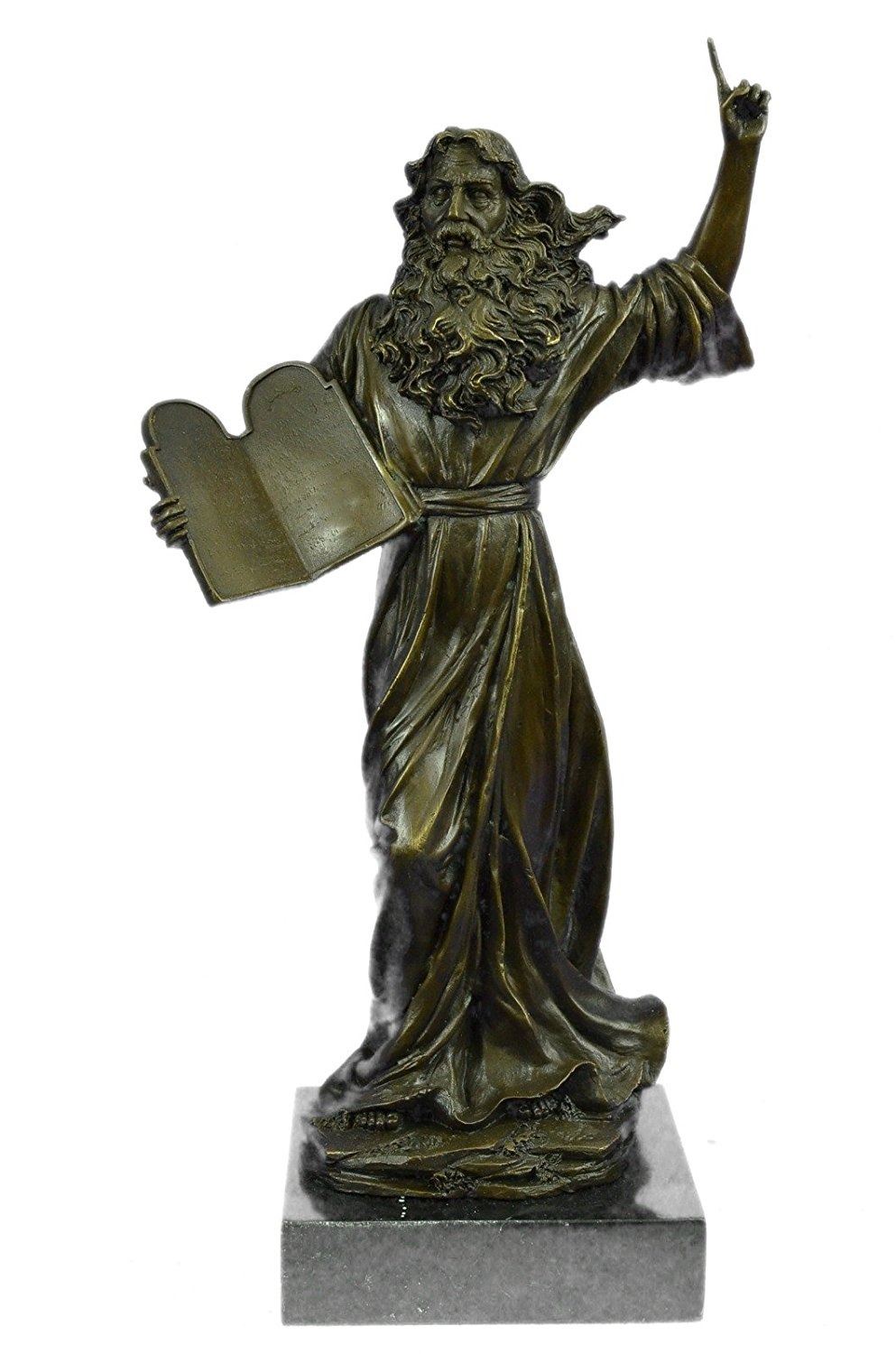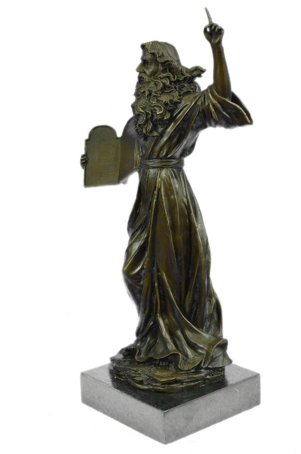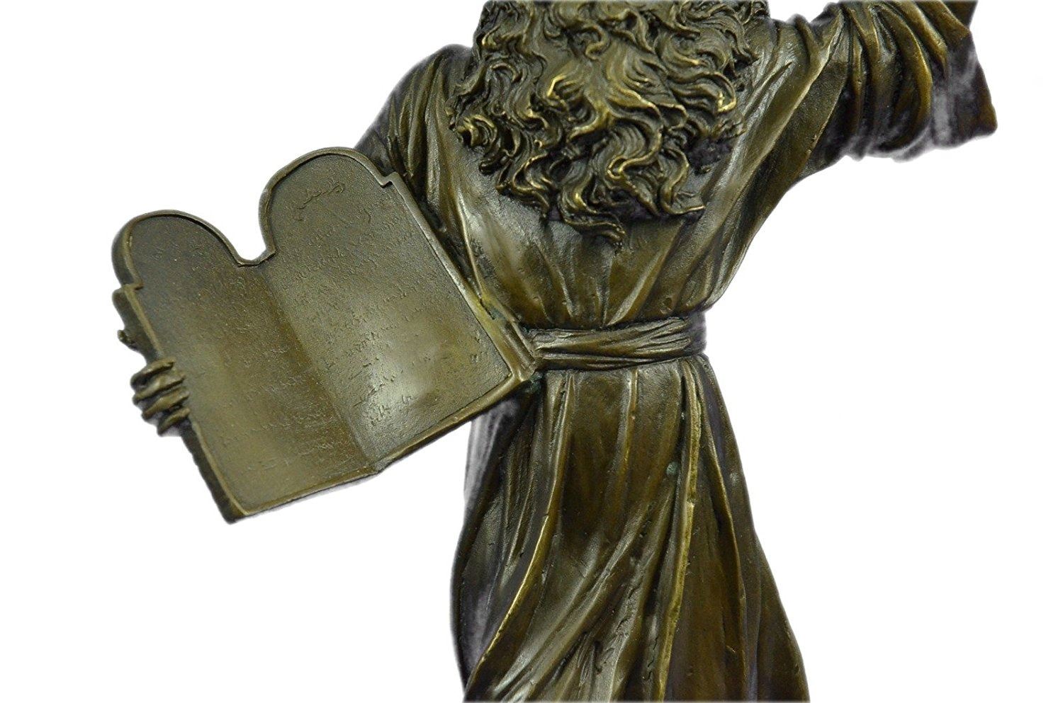 This is his version of Moses bringing the Ten Commandments down from Sinai to the Children of Israel. Moses has a long beard and rough robe. He cradles the tablets in one arm and gestures dramatically with the other. The figure is mounted on a marble base. This Extremely Detailed and Well-Made statue of Moses measures 12 inches Tall. Made with hot cast bronze, polished, individually antiqued and painted with dark brown patina by hand, the definition and the intricate details of this piece is simply breathtaking. The photograph does not do it justice. The special production process of this piece, originated from Europe, uses actual bronze in hot cast in order to ensures a richer, more life-like presentation. This piece has a substantial feel to it and is heavy for its size. The bottom is furnished with felt for the protection of your furniture. Simply put, this is very much a Class Act Quality Product. Bronze Dimensions with Marble Base: Height 14 X Width 8 inches. Weight: 10 LBS. Inventory: 1345B36631