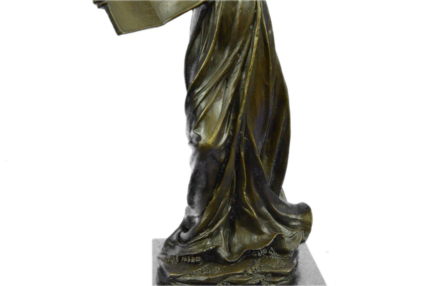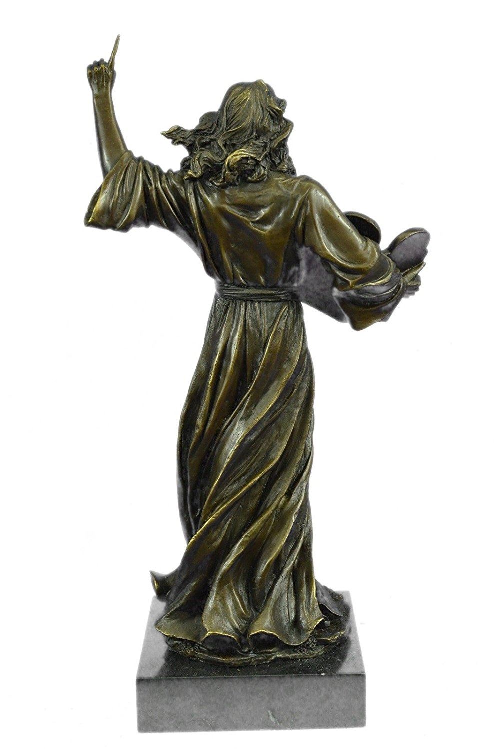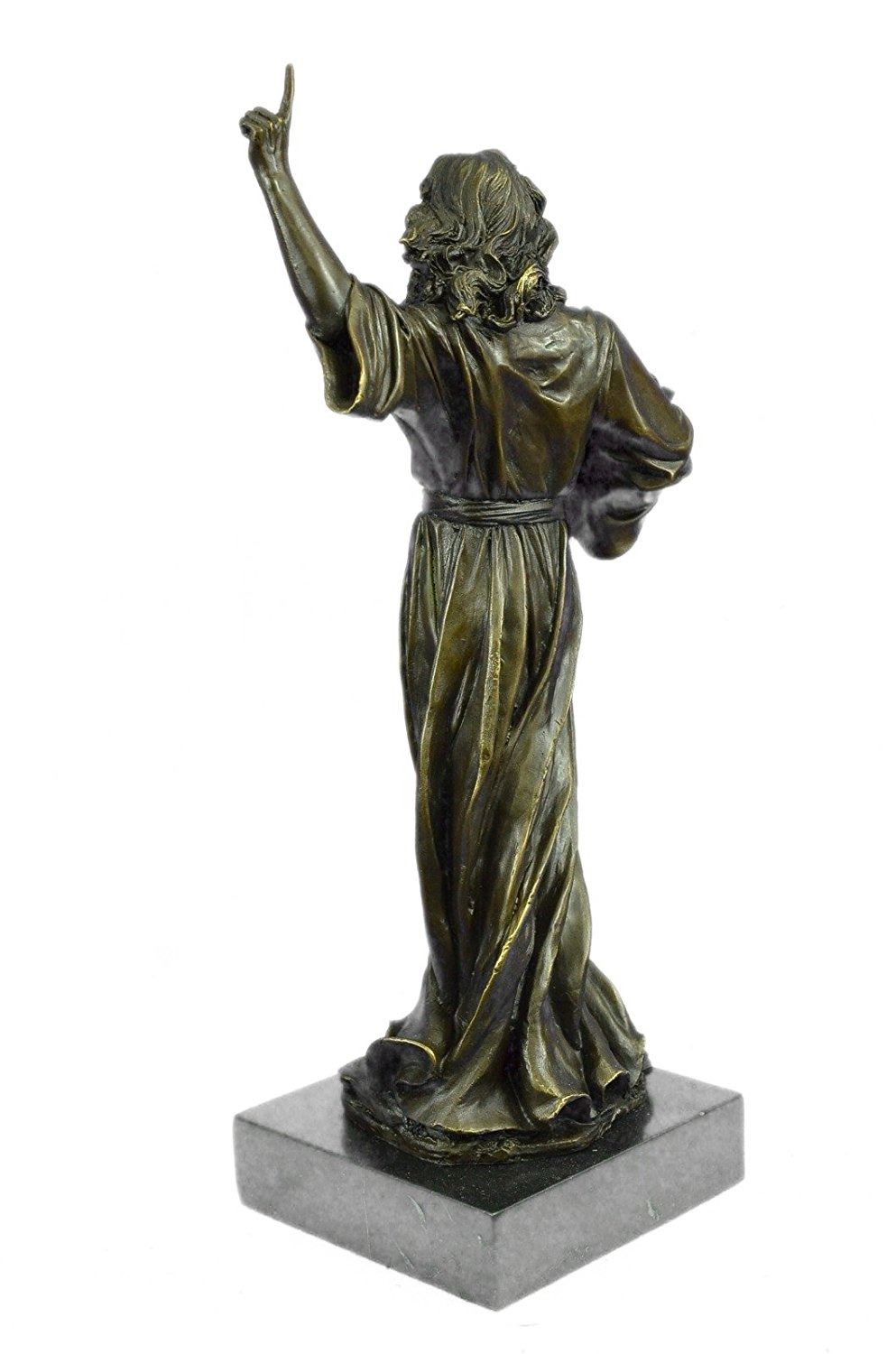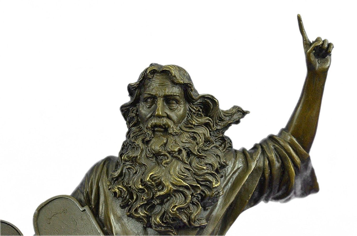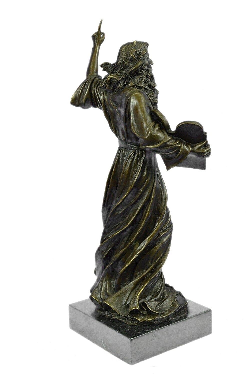 This is his version of Moses bringing the Ten Commandments down from Sinai to the Children of Israel. Moses has a long beard and rough robe. He cradles the tablets in one arm and gestures dramatically with the other. The figure is mounted on a marble base. This Extremely Detailed and Well-Made statue of Moses measures 12 inches Tall. Made with hot cast bronze, polished, individually antiqued and painted with dark brown patina by hand, the definition and the intricate details of this piece is simply breathtaking. The photograph does not do it justice. The special production process of this piece, originated from Europe, uses actual bronze in hot cast in order to ensures a richer, more life-like presentation. This piece has a substantial feel to it and is heavy for its size. The bottom is furnished with felt for the protection of your furniture. Simply put, this is very much a Class Act Quality Product. Bronze Dimensions with Marble Base: Height 14 X Width 8 inches. Weight: 10 LBS. Inventory: 1345B36631