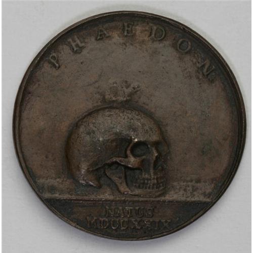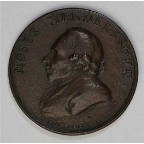 <B>Moses Mendelssohn Medallion by J. Abraham.</B></I> 42 mm. This famous medallion shows the portrait of Mendelssohn as the intellectual head of German Jewry. The piece has minor environmental damage; still, an important piece of Judaica.