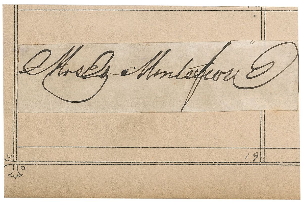One of the most famous British Jews of the 19th century. Montefiore was a financier, banker, philanthropist, and Sheriff of London. Ink signature, “Moses Montefiore,” on an off-white 3.75 x 1 clipped slip affixed to a 4 x 2.5 off-white card. In very good condition, with scattered toning and soiling and closely trimmed edges.