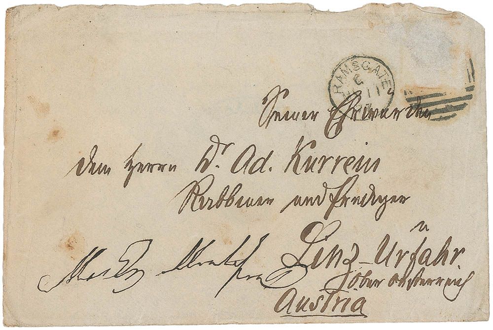 One of the most famous British Jews of the 19th century. Montefiore was a financier, banker, philanthropist, and Sheriff of London. Mailing envelope, 5.75 x 4, addressed in a secretary’s hand, in German, to Rabbi Dr. Adolf Kurrein in Linz, Austria, and signed in the lower left corner “Moses Montefiore.” In very good condition, with scattered creases and wrinkles, mild toning, and light surface loss to top right corner.
