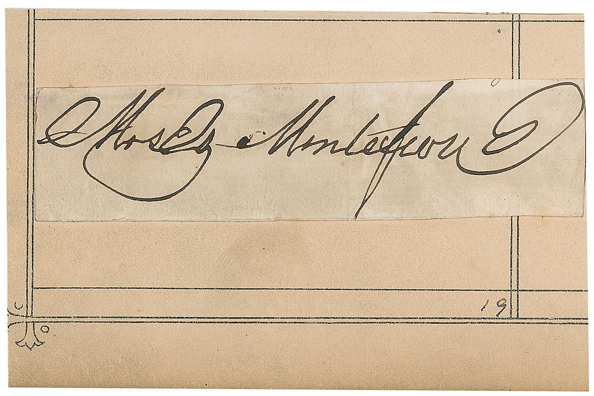 One of the most famous British Jews of the 19th century. Montefiore was a financier, banker, philanthropist, and Sheriff of London. Ink signature, “Moses Montefiore,” on an off-white 3.75 x 1 clipped slip affixed to a 4 x 2.5 off-white card. In very good condition, with scattered toning and soiling and closely trimmed edges.