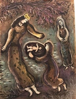 Marc Chagall Lithograph, "Moses and Aaron Before Pharaoh", Marc Zakharovich Chagall was a Russian-French artist of Belarusian Jewish origin. An early modernist, he was associated with several major artistic styles and created works in virtually every artistic format, including painting, book illustrations, stained glass, stage sets, ceramic, tapestries and fine art prints.