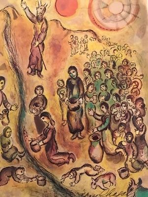 Marc Chagall Lithograph, "Moses and the Burning Bush ", Marc Zakharovich Chagall was a Russian-French artist of Belarusian Jewish origin. An early modernist, he was associated with several major artistic styles and created works in virtually every artistic format, including painting, book illustrations, stained glass, stage sets, ceramic, tapestries and fine art prints.