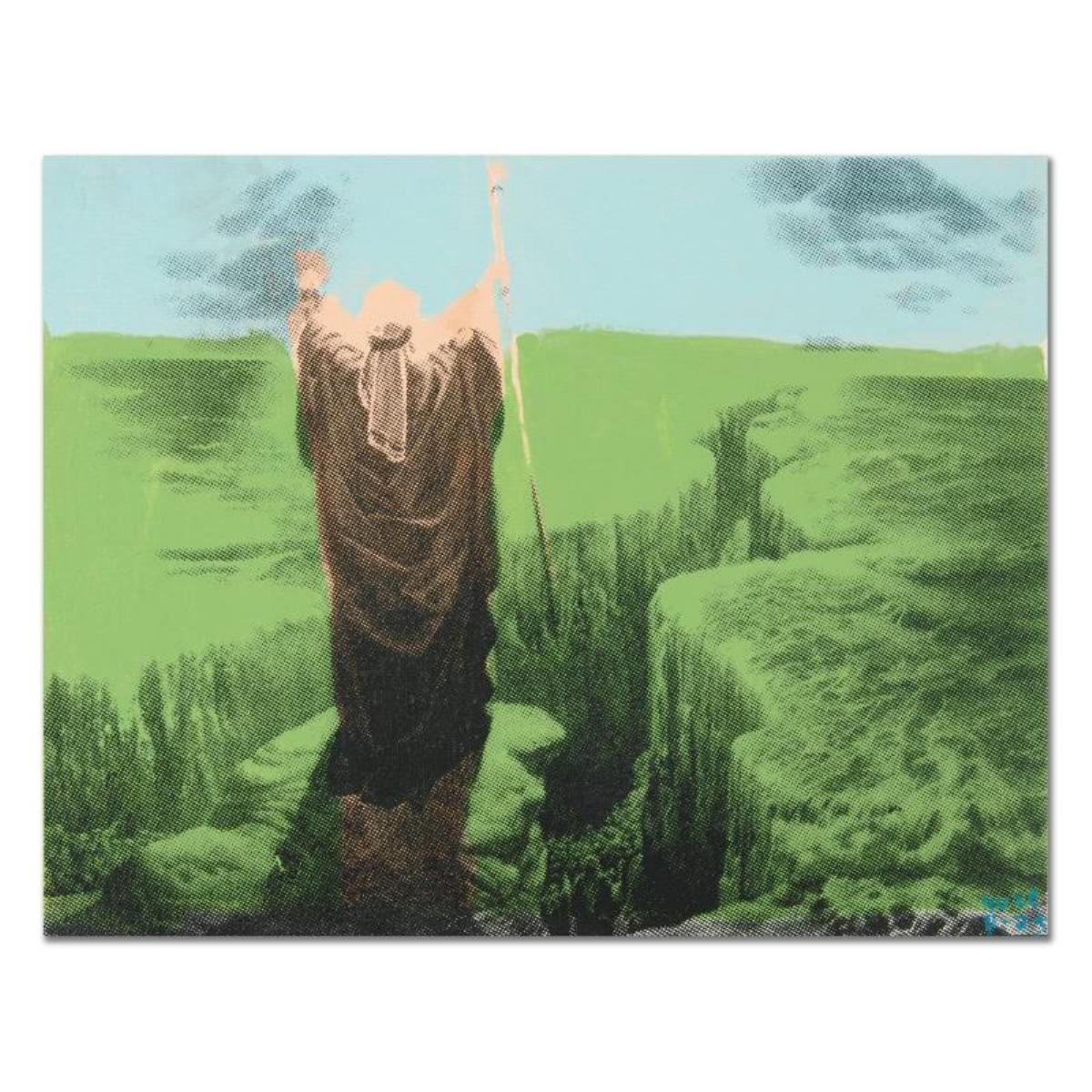 "Moses" is a one-of-a-kind hand-pulled silkscreen and mixed media painting on canvas by Ringo - protege of Andy Warhol's apprentice, Steve Kaufman. This piece is hand signed by the artist and Includes Certificate of Authenticity. This piece comes from the Andy Warhol Legacy Series. Due to the nature of the canvas these, pieces will need to be mounted for framing. Measures approx. 16" x 12" (image).