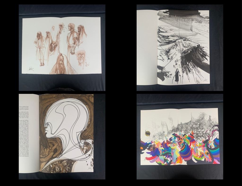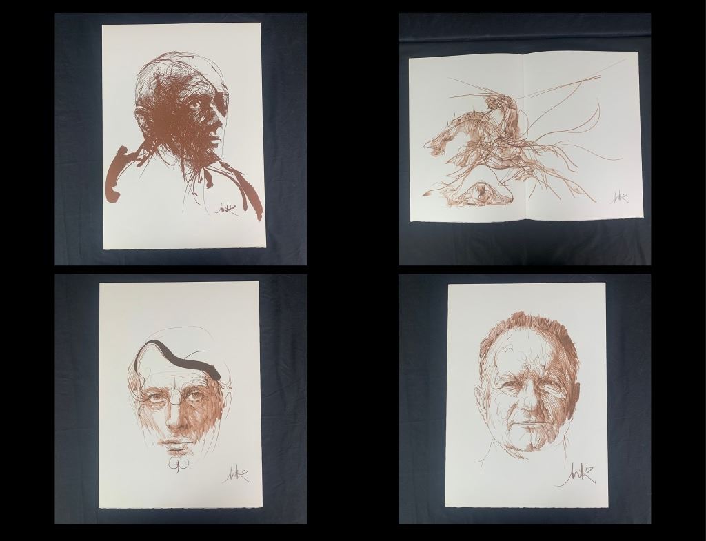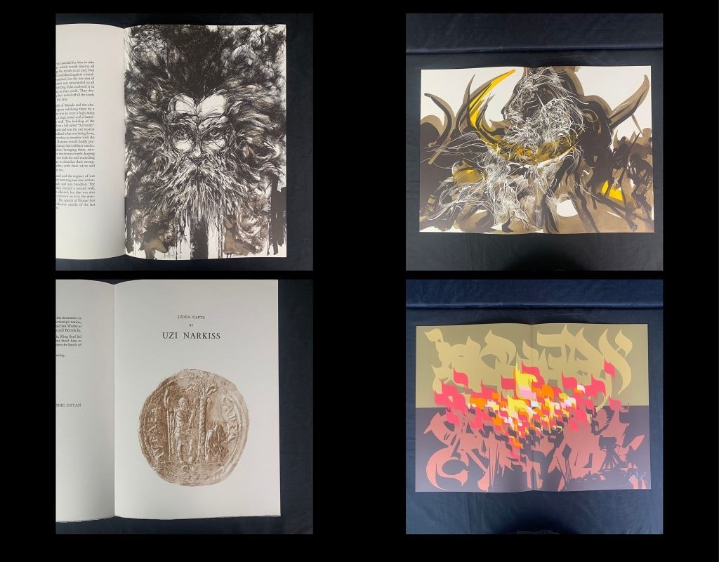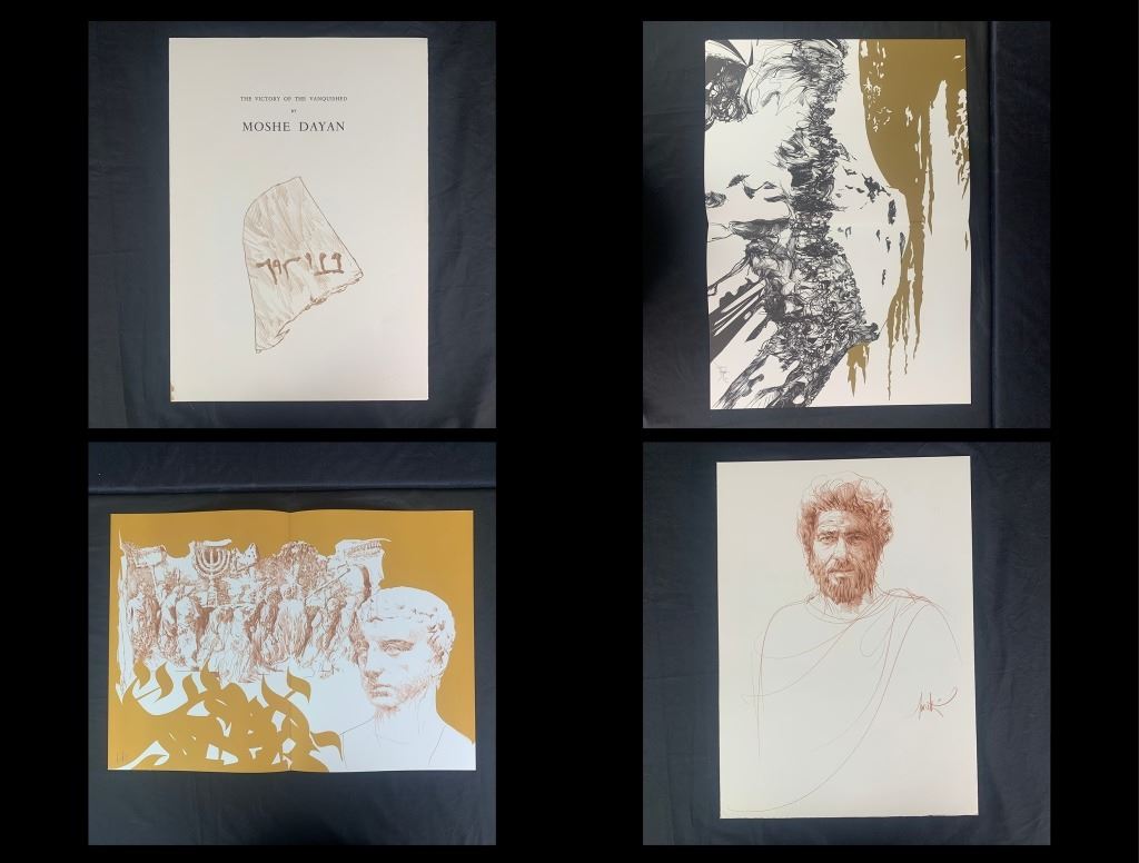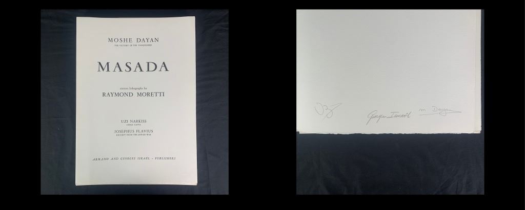A 16 lithograph set by Raymond Moretti, about Moshe Dayan and Masada. Includes its original folder from the publisher, Aramand and Georges Israel. Signed by Uzi Narkiss (Judea Capta), Georges Israel (Publisher) and Moshe Dayan. An exceptional collection, rarely offered. All prints in excellent condition, but folder does appear to have some water damage.