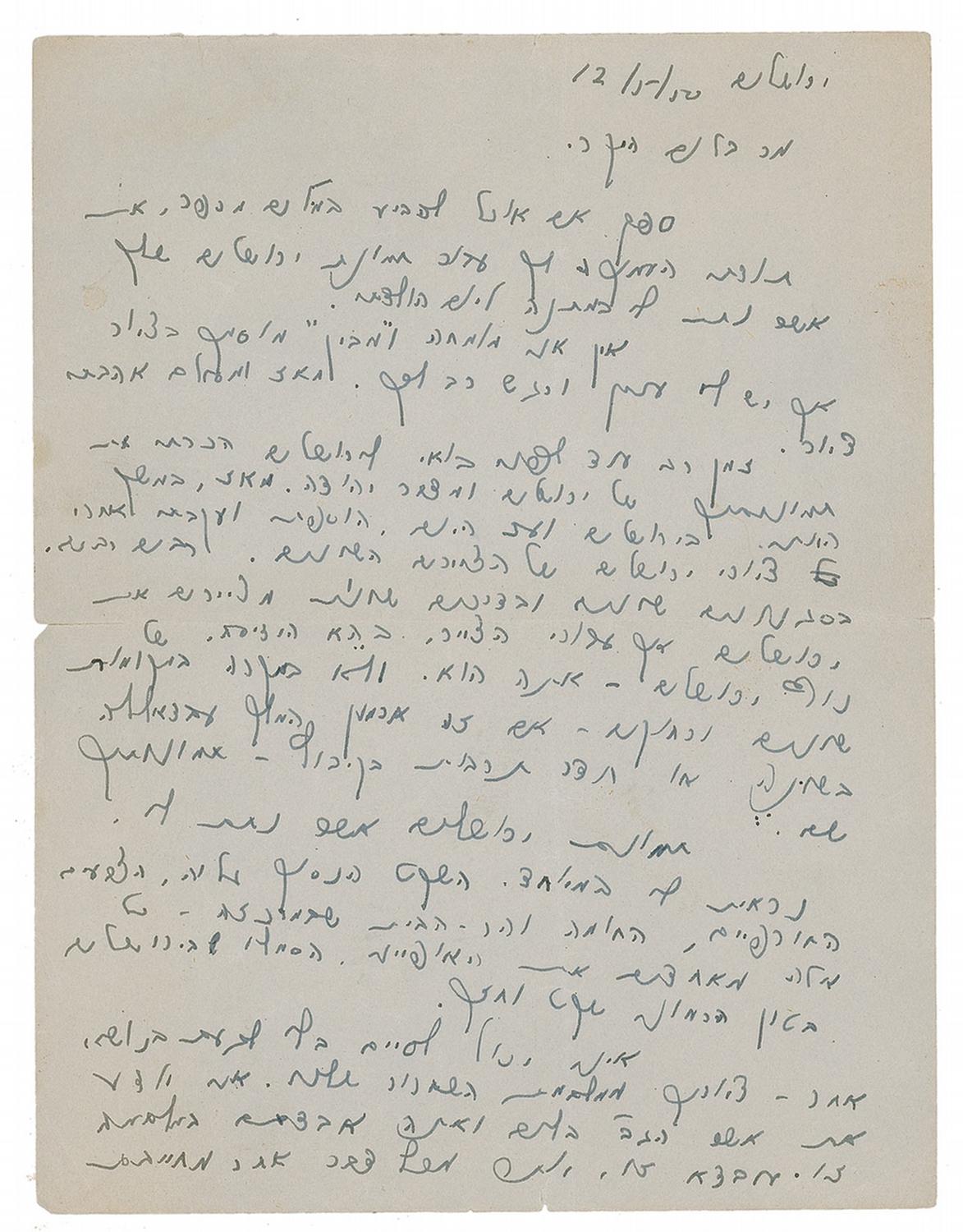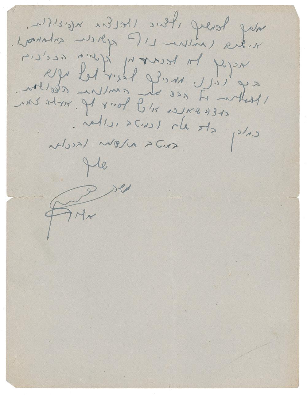 ALS in Hebrew, two pages, 5.25 x 7, May 12, 1950. Letter to painter Ludwig Blum thanking him for a gift. In part: “I doubt that I can express in a few words my heartfelt thanks to you for your painting of Jerusalem that you gave me for my birthday. I am not trained, nor am I a certified “expert” in painting, but I have a great deal of interest and feelings for the subject. I have always loved painting. For some time before I came to Jerusalem, I was familiar with your paintings of Jerusalem and of the Judean Desert. Since then, during my time in Jerusalem and up until today, I have continued to take an interest in paintings of Jerusalem made by various artists…I cannot conclude without touching on another subject–your paintings of our War of Independence. I know what you and Mrs. Blum lost in this war. That fact, more than anything else gives you the obligation to continue to paint and to eternalize personal episodes and images of landscapes that are tied to our wars. I must ask you not to be daunted by the difficulties inherent in this and I urge you to go everywhere and to commit to canvas the pictures that are necessary.” Some light separations to central horizontal fold to each page, one fold through portion of signature, and scattered light toning and wrinkling, otherwise fine condition. Excellent content from a key figure of the State of Israel.