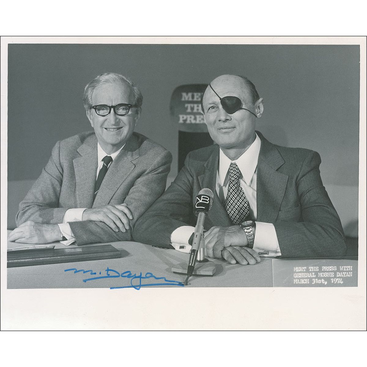 Matte-finish 10 x 8 photo of Dayan and Lawrence Spivak on the set of Meet the Press in 1974, signed in blue felt tip, “M. Dayan.” In fine condition, with a couple of mild creases.