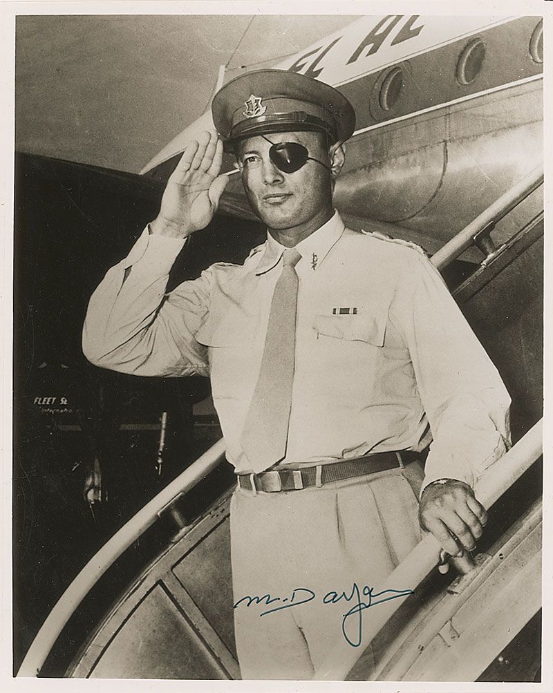 Glossy 8 x 10 photo of Dayan saluting while departing from a plane, signed in black felt tip, “M. Dayan.” In fine condition, with scattered surface bends.