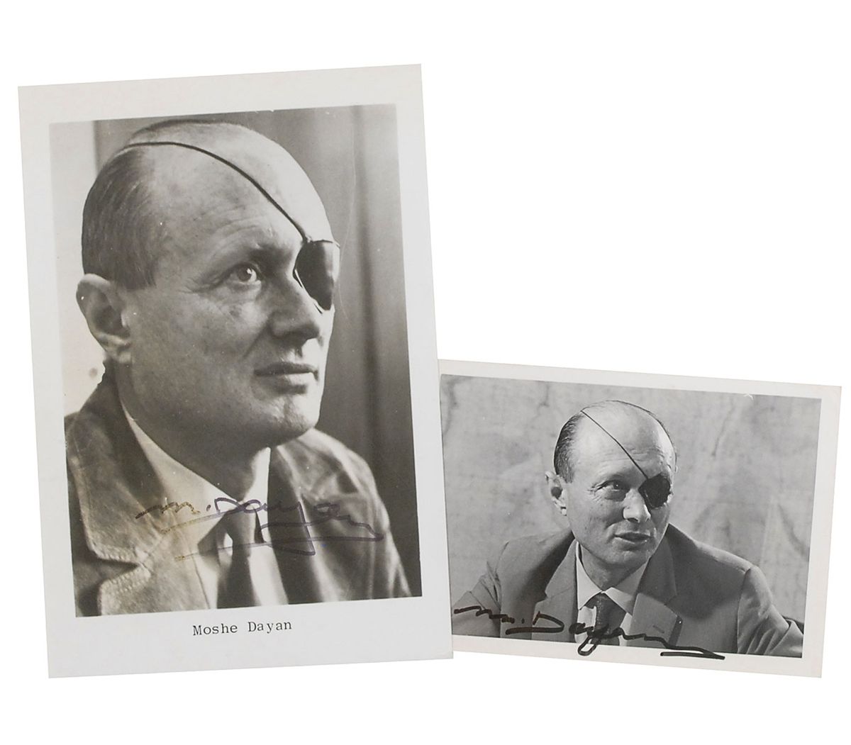 Glossy 5 x 7 head-and-shoulders photo of Dayan wearing his trademark eyepatch, signed in black felt tip, “M. Dayan”; and a glossy 5 x 3.5 photo of the Israeli military leader seated in front of a world map, also signed in black felt tip, “M. Dayan.” In overall fine condition, with irregular ink adhesion to the start of one signature. Accompanied by a letter of transmittal from an assistant dated 1975.