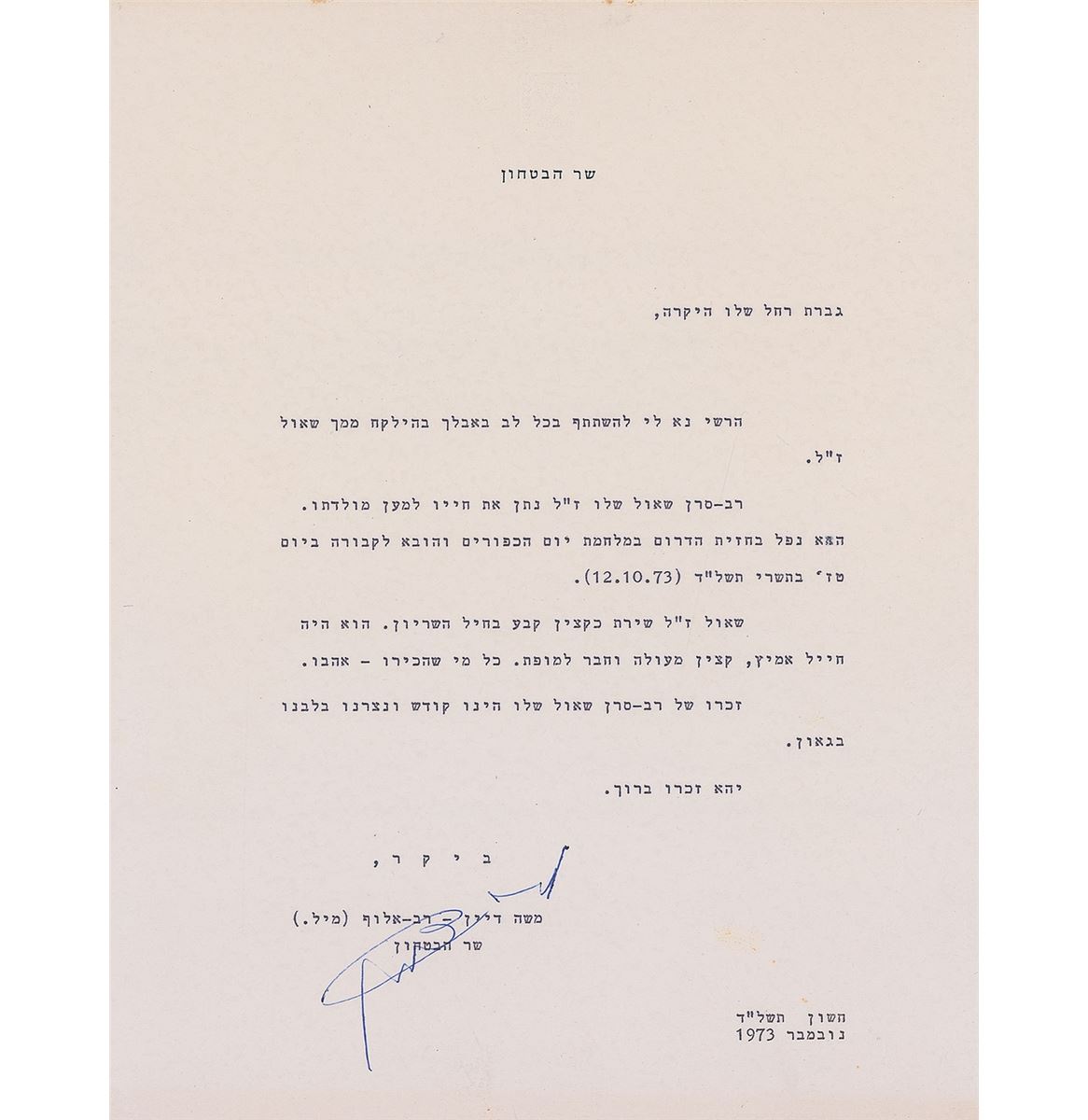 TLS in Hebrew, one page, 8.5 x 11, blindstamped personal letterhead, 1973. Untranslated letter of condolences to the widow of an Israeli officer who had fallen in the Kippur War. In fine condition, with trivial creasing to edges and some light spots of foxing.