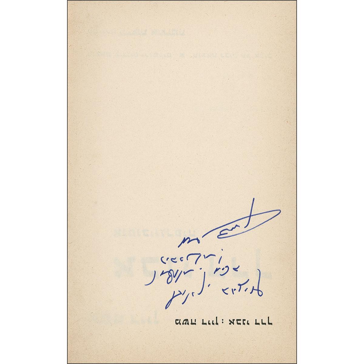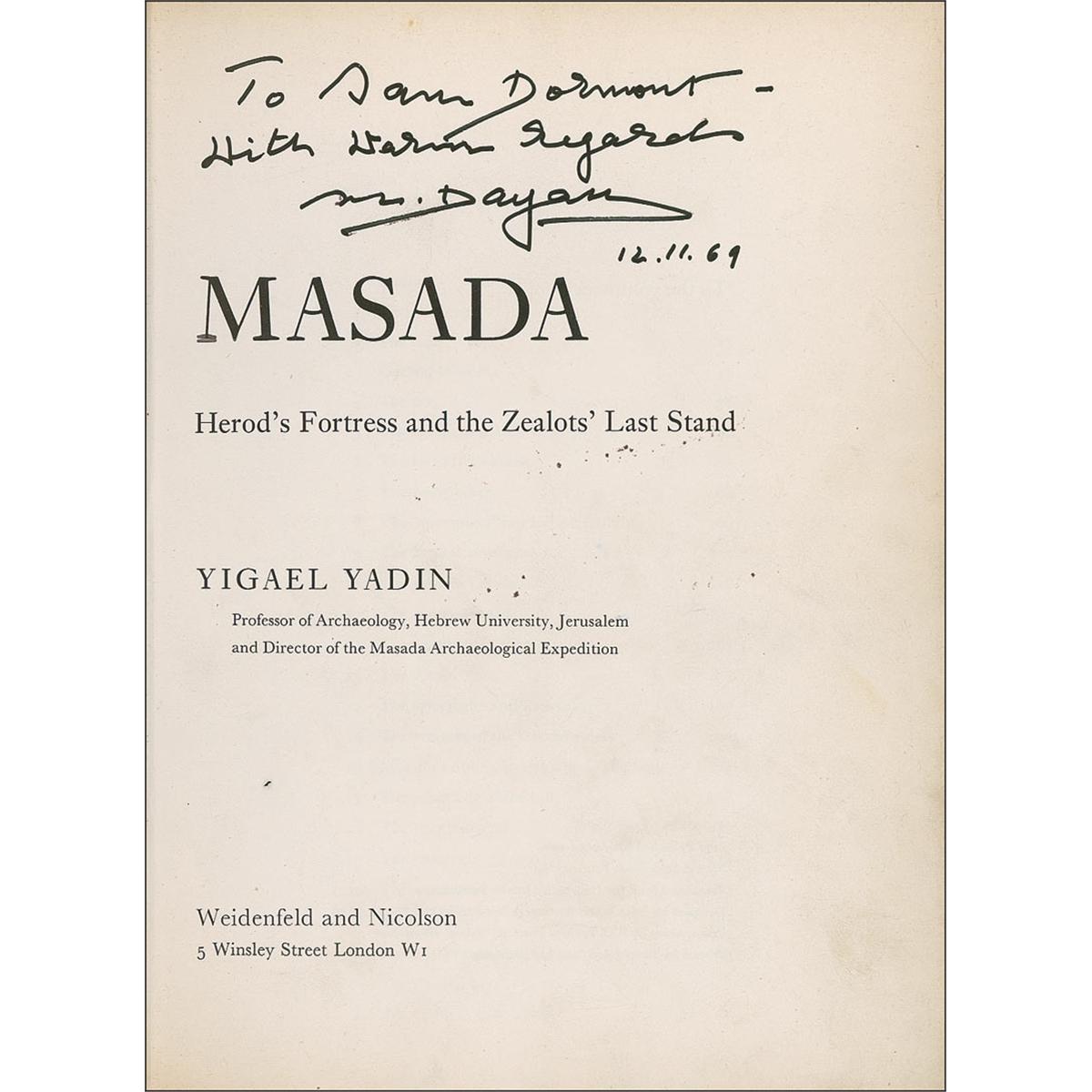Two hardcover books: Masada, a story of the first Jewish-Roman War and the Jewish defense of a fortress under siege, signed and inscribed in black felt tip on the title page; and The Story of My Life, Dayan’s autobiography, in Hebrew, signed and inscribed in Hebrew in blue felt tip on the half-title page. In overall very good condition.