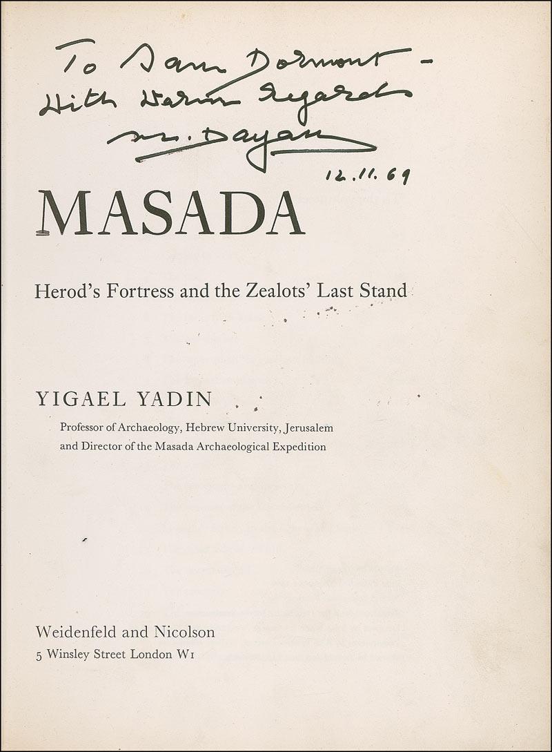 Two hardcover books: Masada, a story of the first Jewish-Roman War and the Jewish defense of a fortress under siege, signed and inscribed in black felt tip on the title page; and The Story of My Life, Dayan’s autobiography, in Hebrew, signed and inscribed in Hebrew in blue felt tip on the half-title page. In overall very good condition.