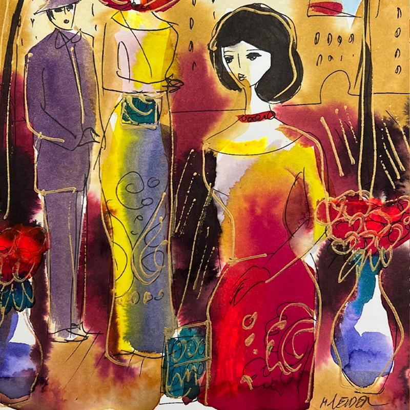 This is an original mixed media watercolor painting on paper by Moshe Leider. Hand signed by the artist, this piece comes custom framed and includes a Letter of Authenticity. Measures approximately 16" x 15" (frame), 9" x 8" (image).