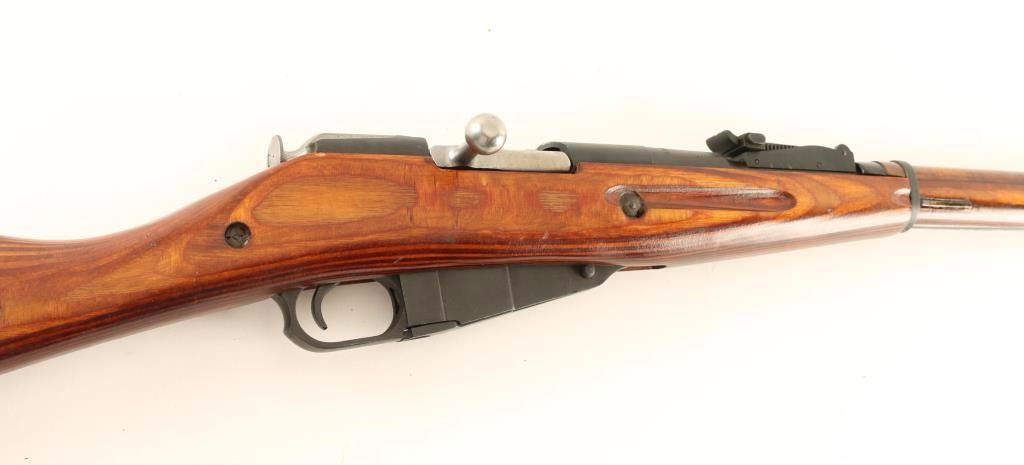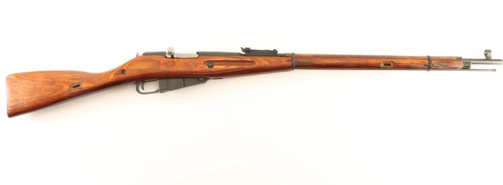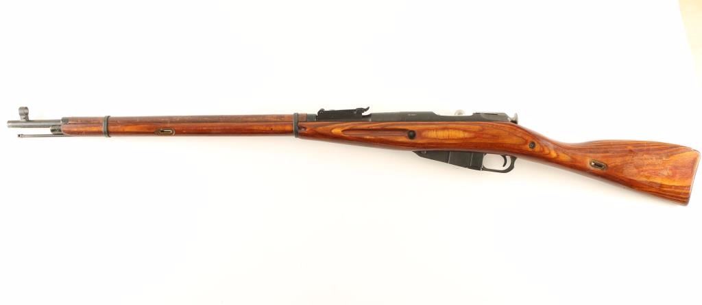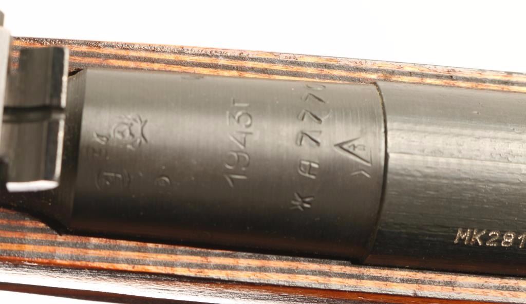 SN: KA7770/MK2817 Russian military bolt-action service rifle chambered in 7.62x54Rmm, circa 1943. Imported by T.G.I. of Knoxville, TN with import marks on the barrel. Featured a blued finish, Izhevsk marked 28.7" tapered barrel, hooded post front sight, tangent rear sight graduated to 2,000 meters, cleaning rod, 5 round fixed box magazine, straight bolt handle, two barrel bands, smooth wood handguard and straight grip shoulder stock with metal buttplate. Matching serial numbers on barrel, bolt(forced), and floorplate(forced). Rifle retains approximately 97% of it's blued finish showing little wear and some light scattered handling marks. Action is smooth, bore is dull with very good rifling and wood stocks are very good+ with the majority of the wear/blemishes on the handguard. Condition is very good+++. ***C&R Firearm*** ***Modern Firearm***
