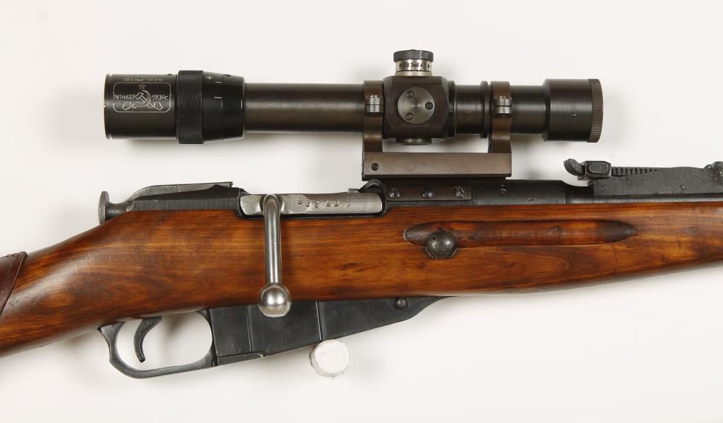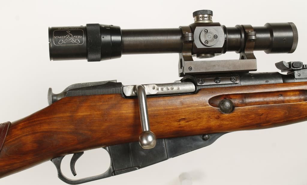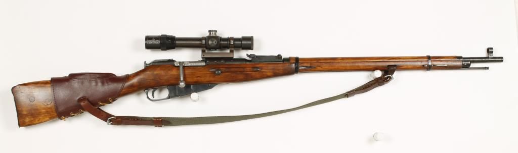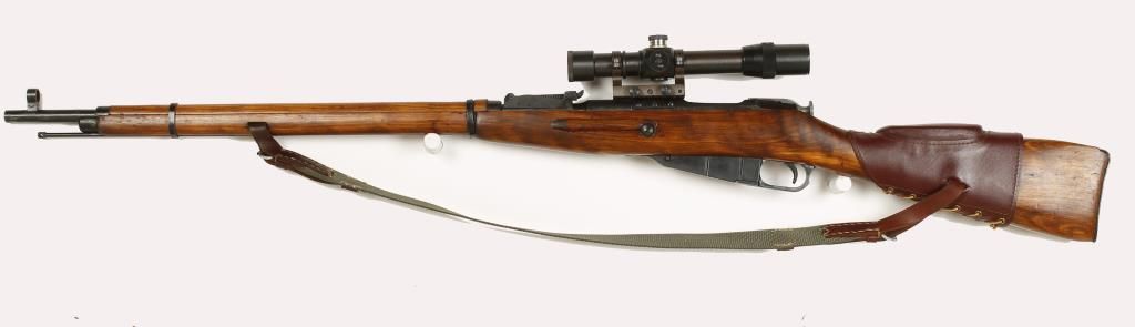 Russian military bolt action sniper rifle dated 1943 with top mount scope. Bolt is turned down with matching numbers, wood stock shows good cartouches with leather cheek piece. Scope has Russian markings and post type optics. Good bore and action. Condition: Good showing probable refinish and wood is good. *Curio & Relic Firearm*