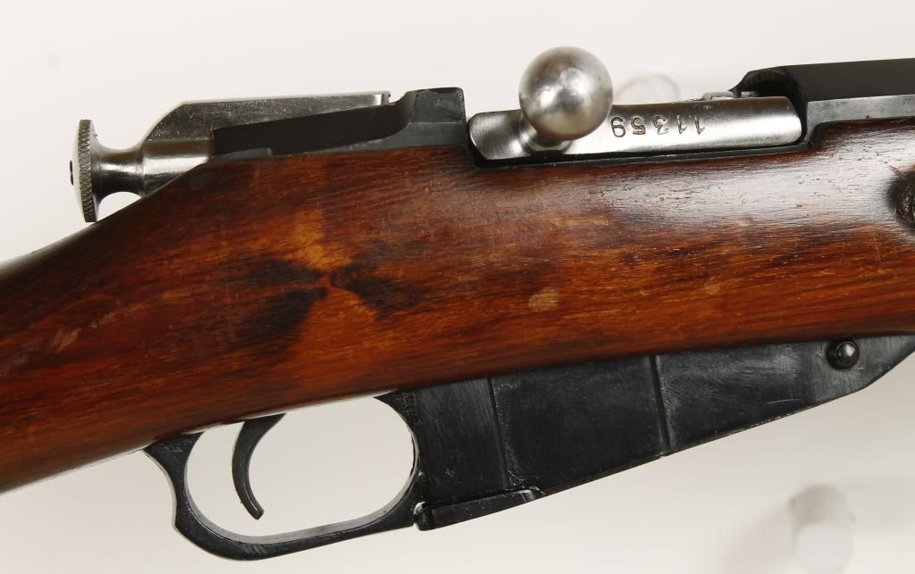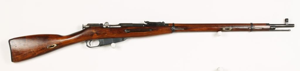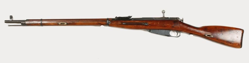 Russian made bolt action military rifle dated 1926 with 28-3/4" barrel. Blued finish, octagonal receiver, straight grip wood stock, hooded front sight, graduated rear sight to 2,000 meters and steel butt plate. Good bore and action. Condition: Good overall showing possible refinish. *Curio & Relic Firearm*