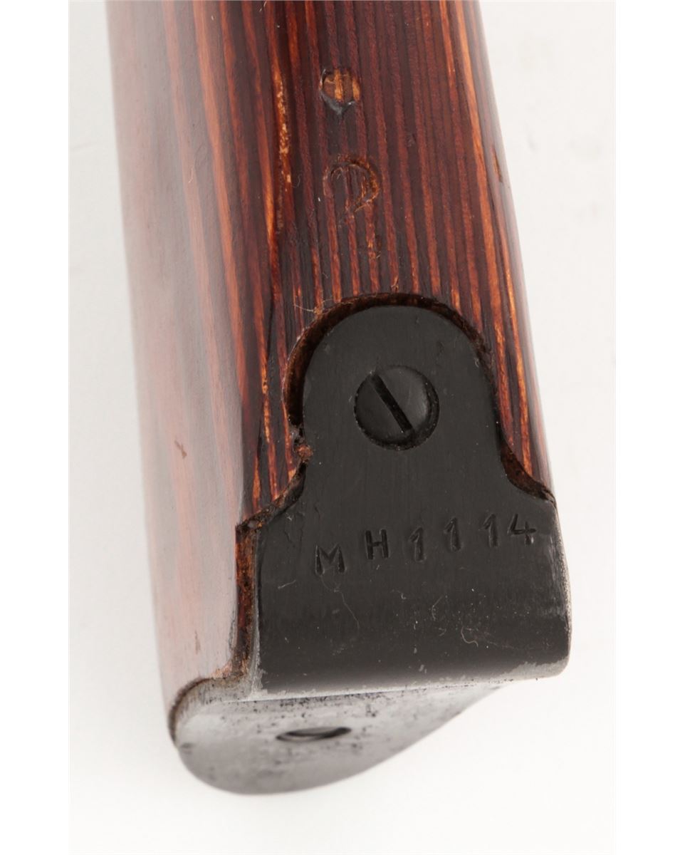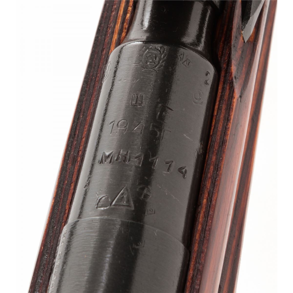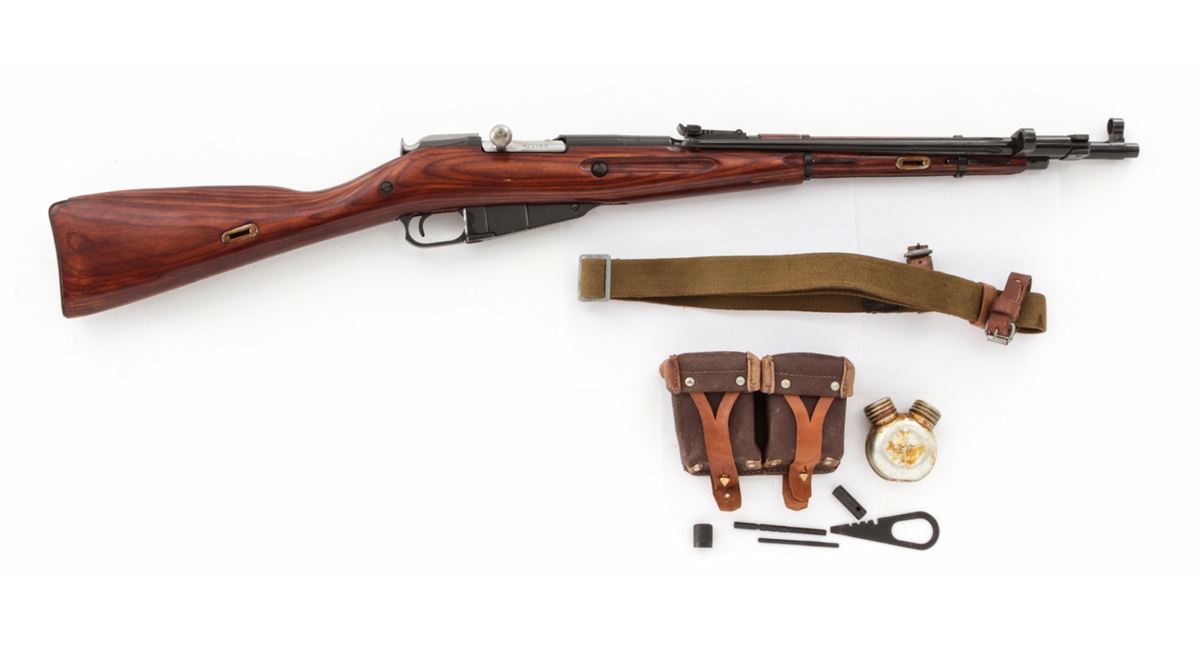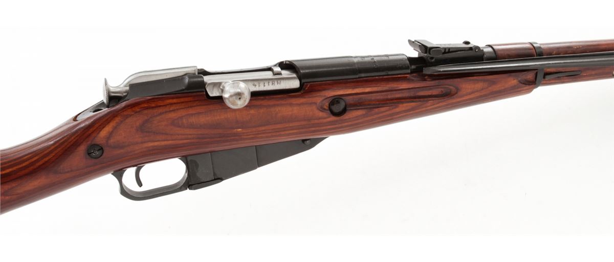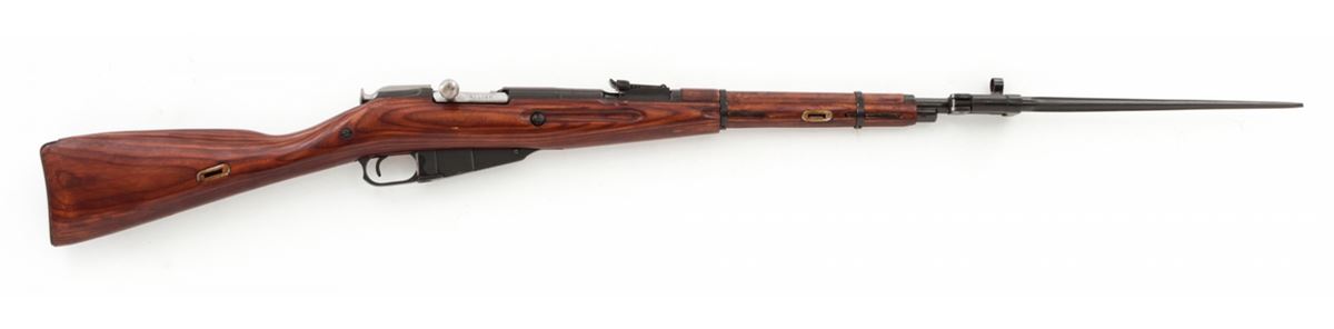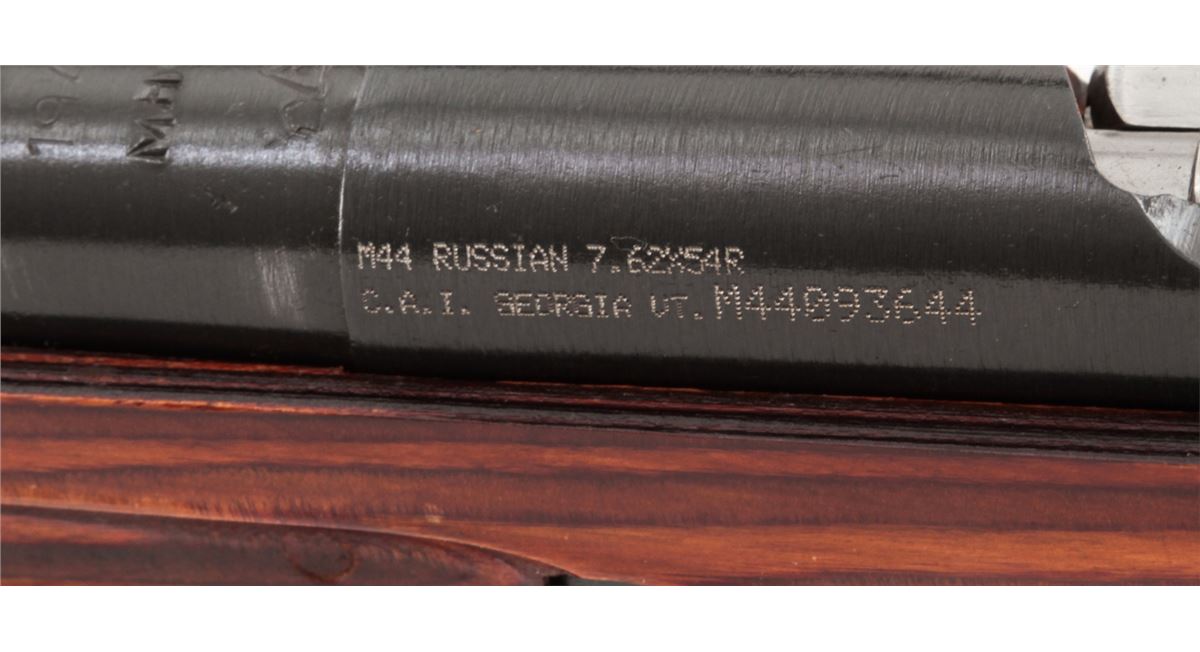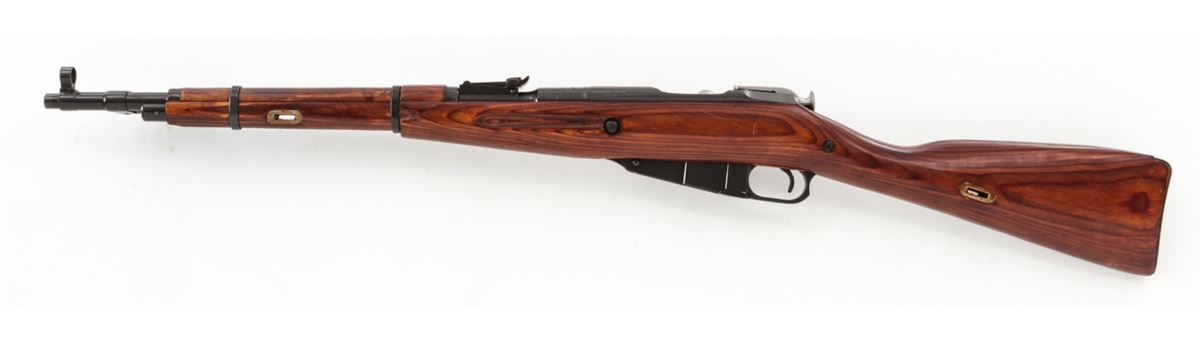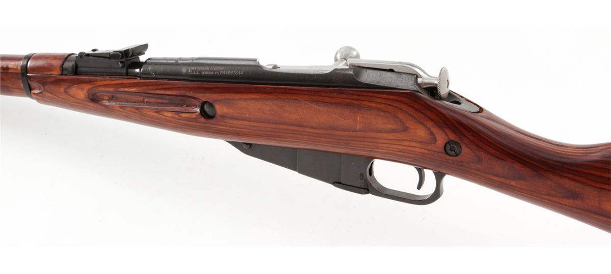 Mosin-Nagant Model 1944 Bolt Action Carbine, #M44093644, 7.62x54R cal., 20.5'' barrel, blue finish, laminated hardwood stock, with sling and cleaning kit. Condition is excellent as imported in the early 1990s. Stock with scuffs to finish. Matching numbered bolt and some mixed parts. Action is crisp, bore is good. Lightly import marked. Est.: $200-$300. (C&R)