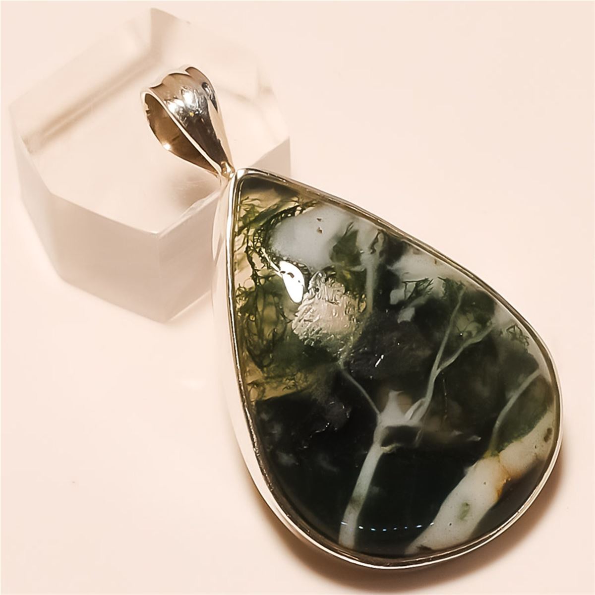 Moss Agate Pendant Solid Sterling Silver Length:1.75 inch Weight:10 gram #P-265
