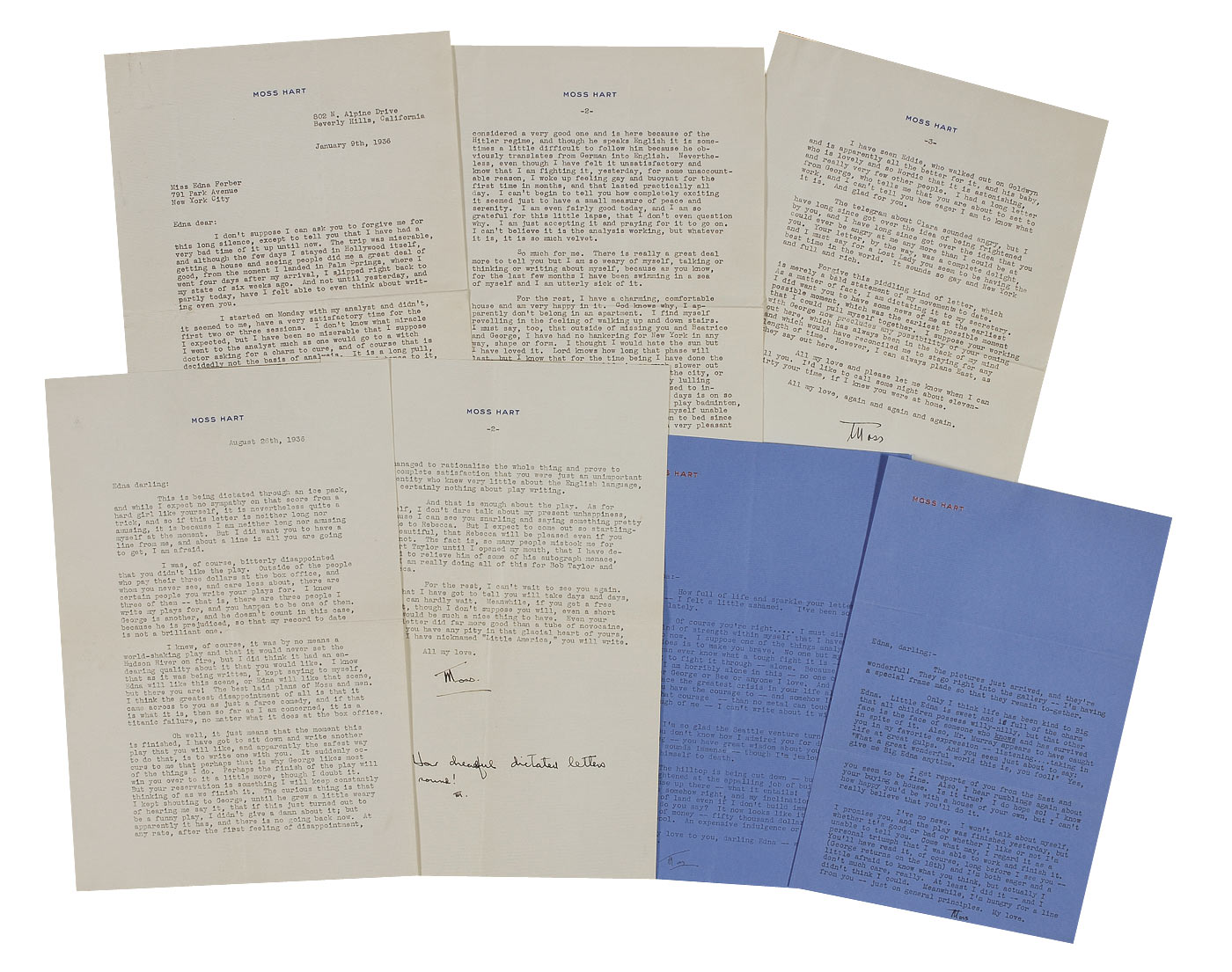Pulitzer Prize-winning playwright (1904-1961), he was most notably known for You Can’t Take It With You and The Man Who Came to Dinner, and also as a Broadway director for the musical, My Fair Lady. Hart endured a lifetime struggle with bipolar syndrome and coming to terms with his homosexuality. Four TLSs, all signed in fountain pen, “T. Moss,” two of the letters dating January 9, 1936 and August 26, 1936, and one mailing envelope postmarked March 30, 1937, all on personal letterhead. All letters are to Edna Ferber, a fellow playwright, each discussing Hart’s therapy (which he calls “analysis”), his daily emotional rollercoaster ride, and his sentiments about the plays he was working on. One letter reads, in part: “I can’t begin to tell you how completely exciting it seemed to just have a small measure of peace and serenity…I am just accepting it and praying it to go on. I can’t believe it’s the analysis working, but whatever it is, it is so much velvet.” Another letter reads, in part: “I was, of course, bitterly disappointed that you didn’t like the play…there are three people I write my plays for, and you happen to be one of them. George [Kaufman] is another, and he doesn’t count in this case, because he is prejudiced…” A final letter reads, in part: “Of course you’re right….I must simply find a kind of strength within myself that I haven’t had up to now…No one but myself, though, can ever know what a tough fight it is––but I’m going to fight it through––alone. Because I know now that I am horribly alone in this––no one can help––not you or George or Bee or anyone I love. And it’s hard to face the greatest crisis in your life alone––but if you have the courage to…than no metal can touch you.” Intersecting folds, light, scattered surface creasing, and a few, faint paper clip imprints, otherwise fine condition. Accompanied by two original mailing envelopes.