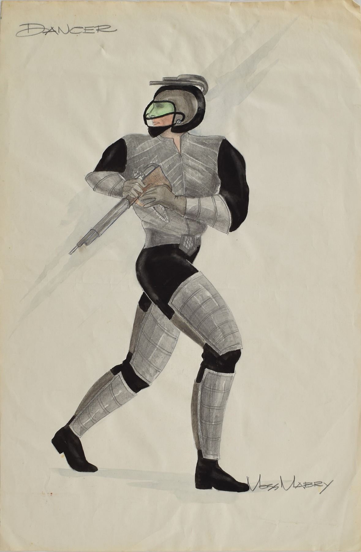 Original costume design sketch of a futuristic "Dancer" from an unknown project by Oscar-nominated costumer Moss Mabry, accomplished in graphite and gouache on an off-white 12 x 17.75 sheet, signed in the lower right in pencil, "Moss Mabry." In very good to fine condition, with scattered creasing and a central horizontal fold. Mabry, whose top credits include Giant, Rebel Without a Cause, and The Way We Were, received four Oscar nominations throughout his distinguished career in costume design.