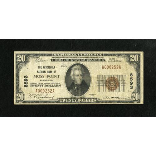<B>Moss Point, MS</B></I> - $20 1929 Ty. 1 <B>The Pascagoula NB</B></I> Ch. # 8593<BR> This $20 has nice edges and paper for the grade while bleed-through is seen for the brown seal and serial numbers. The officers are Th(omas) D(e) Lashmut and W.B. Herring. <B>Fine.</B></I><BR><BR><b>Shipping:</b> Coins & Currency (<a target="_blank" href="http://www.heritageauctions.com/common/shipping.php">view shipping information</a>)