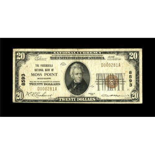 <B>Moss Point, MS</B></I> - $20 1929 Ty. 1 <B>The Pascagoula NB</B></I> Ch. # 8593<BR> Attractive and problem free. <B>Fine.</B></I><BR><I>From The Kansas City Collection.</B></I><BR><BR><b>Shipping:</b> Coins & Currency (<a target="_blank" href="http://www.heritageauctions.com/common/shipping.php">view shipping information</a>)