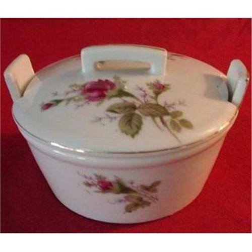 Pretty covered porcelain powder box in the Moss Rose pattern, made in Japan. Trimmed in gold and measures approximately 6" in diameter handle to handle, and 3" high. In wonderful condition with no nicks, chips or cracks.