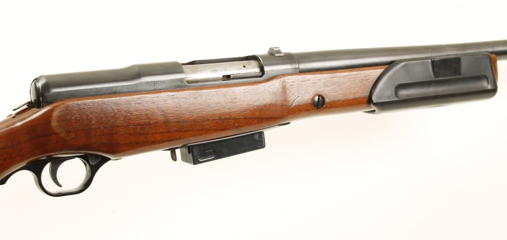 Slide action shotgun with walnut stock, blued barrel and detachable magazine with rubber butt pad. Unique design. Condition is overall Good. Some minor scratches and dings to stock due to use. *Modern Firearm*