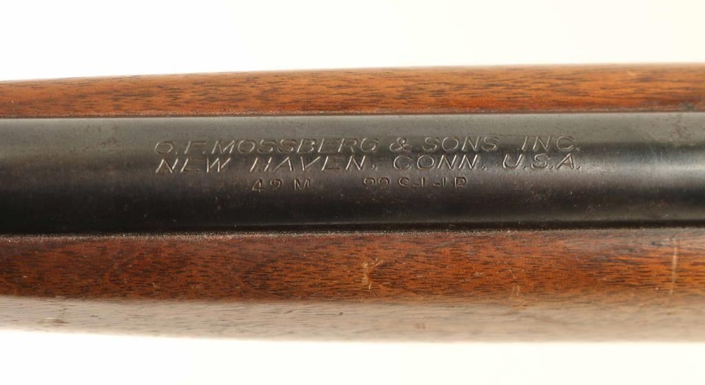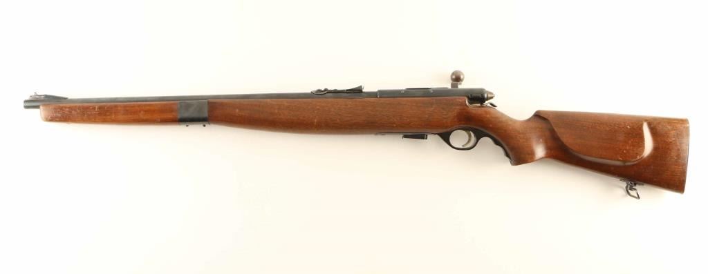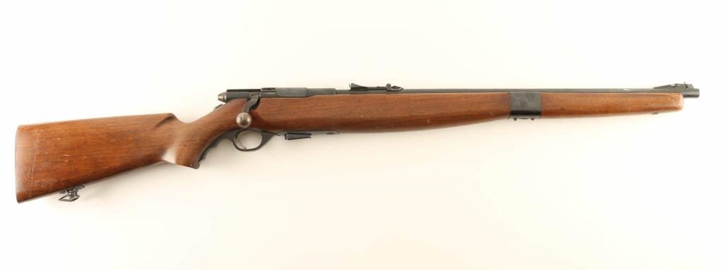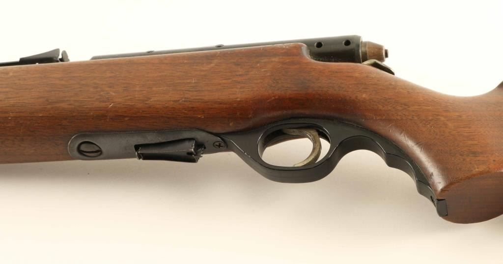 Vintage bolt action sporting rifle chambered for .22 Short, Long & Long Rifle, manufactured circa 1940-1944. Features a blued finish, 23" barrel, interesting ramped front sight with four side-folding leaves(two post, one bead top post and one aperture), adjustable rear sporting sight, detachable 8 round magazine, drilled & tapped receiver, serrated trigger, manual safety, cocked indicator on the rear of the bolt and full-length two piece smooth walnut pistol grip shoulder stock with right-handed cheek rest & trapdoor metal buttplate. Rifle exhibits approximately 70% of it's original blued finish showing scattered wear and light surface rust. Action is sound, the bore is excellent and the wood stocks are good with blemishes & finish loss. Condition is NRA Good. ***Modern Firearm***