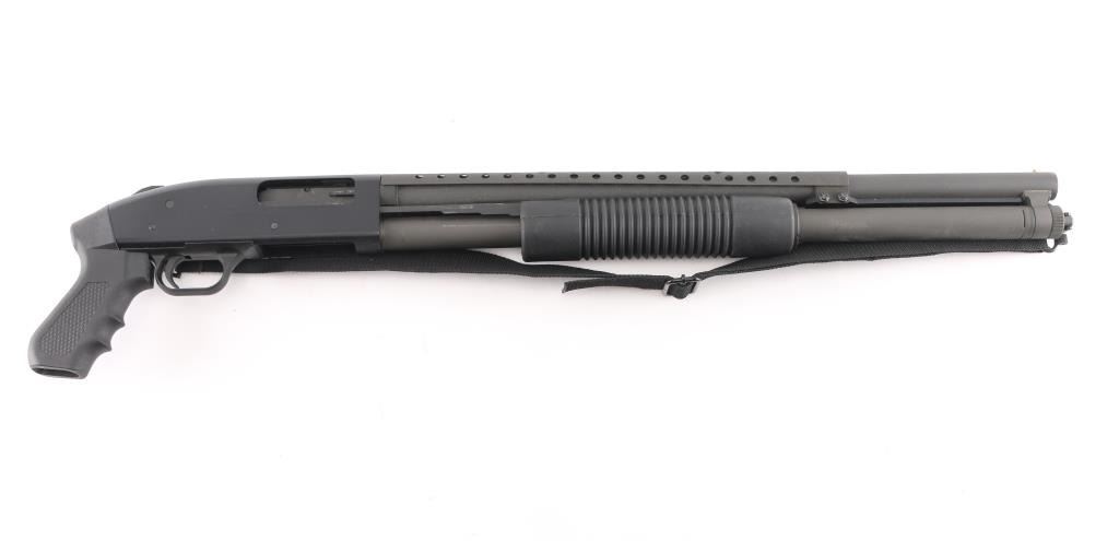 American made slide action repeating shotgun chambered for 2 3/4" & 3" 12 gauge shells. Features a matte black/parkerized finish, 20.5" cylinder choke barrel, ventilated metal heat shield, brass bead front sight, near full-length tube magazine with swivel stud on the cap, smooth trigger, sliding tang safety, drilled & tapped alloy receiver, dual action bars, grooved black synthetic slide handle and finger groove pistol grip with integral sling point. Shotgun exhibits approximately 96% of it's original finish showing scattered handling marks, minor scratches. Action is sound, the bore is excellent, bright and the synthetic stocks are fine. Black nylon sling attached.