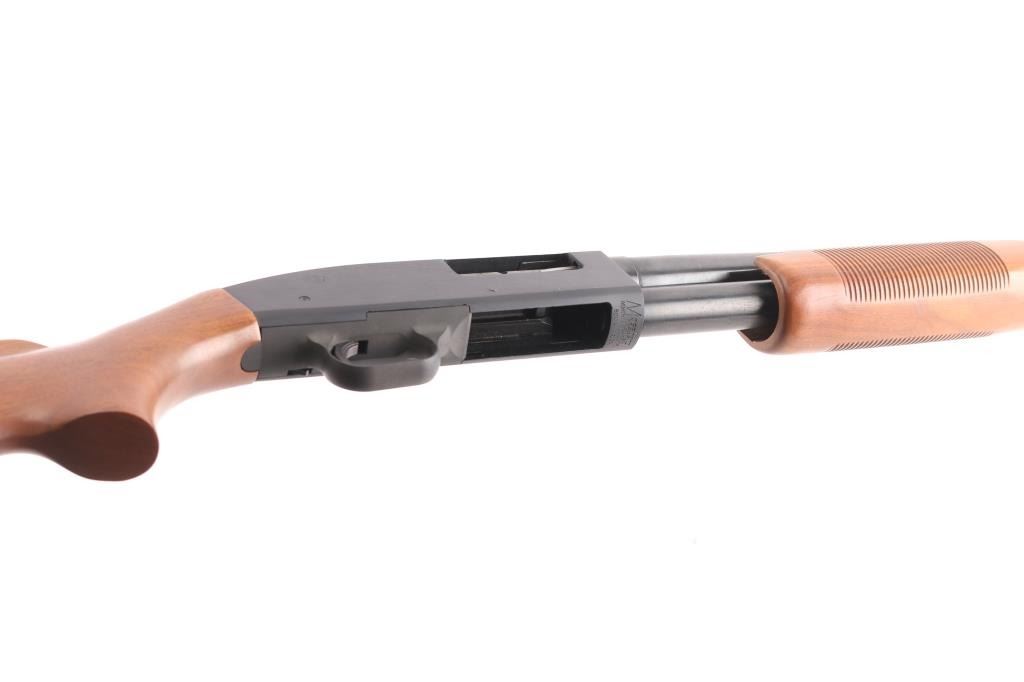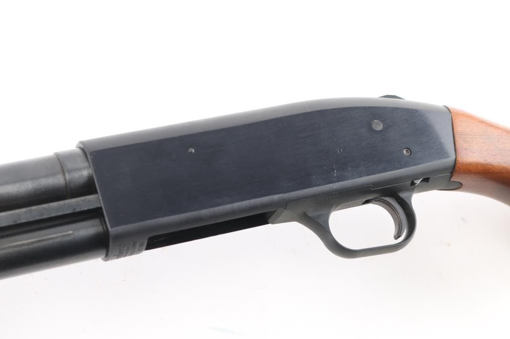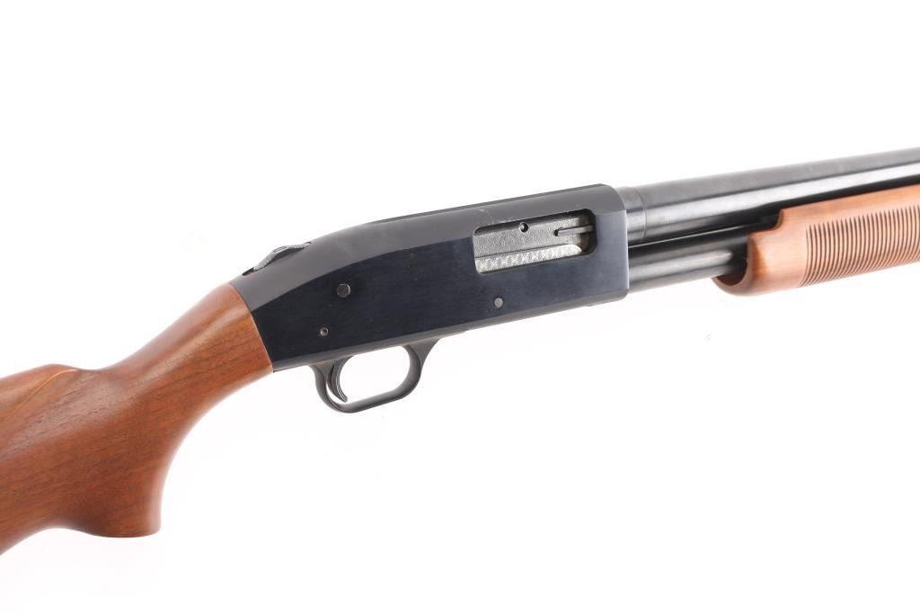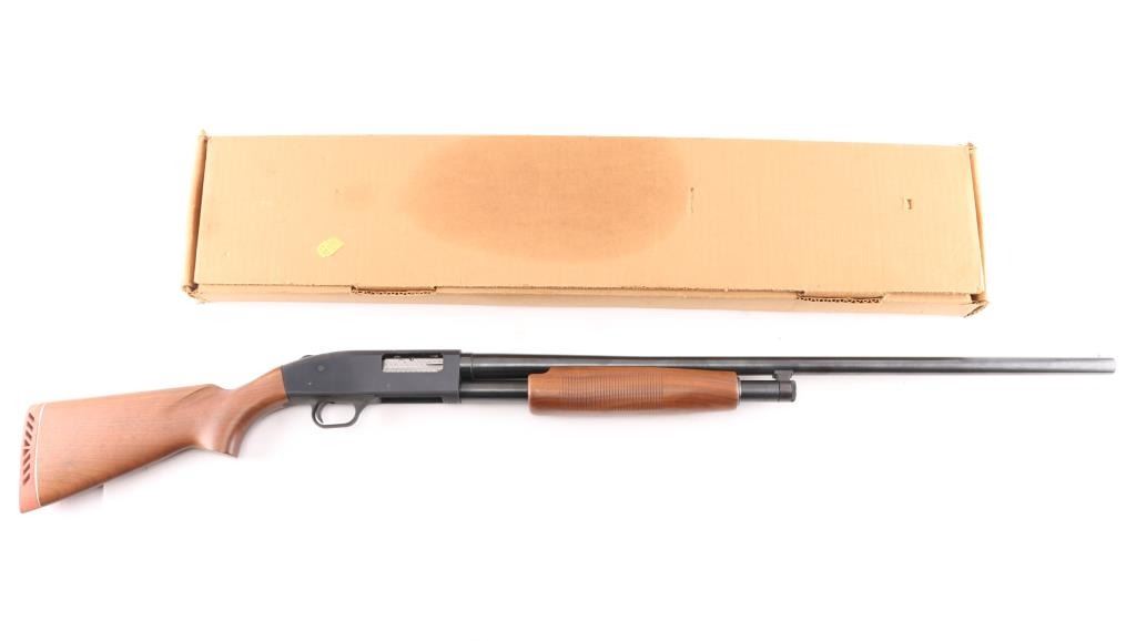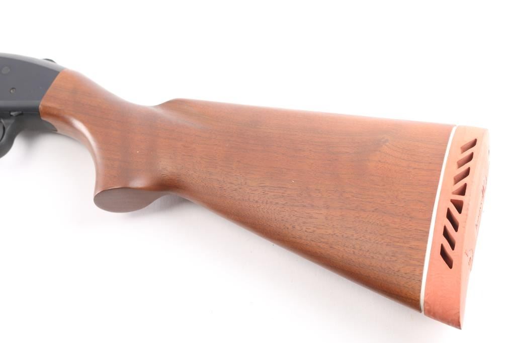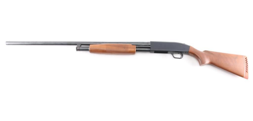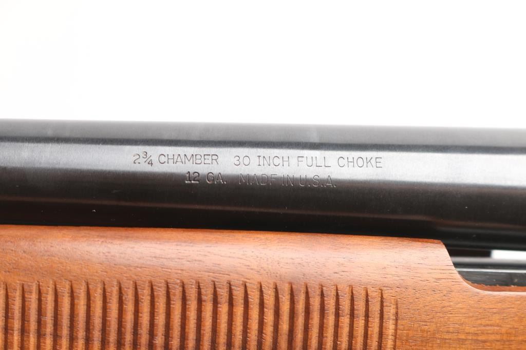Slide action repeating shotgun chambered for 2 3/4" , & 3" 12 gauge shells. Features a blued finish, 30" plain round barrel, brass bead front sight, fixed Full choke. 1/2 length tube magazine, serrated trigger, sliding tang safety, checkered walnut slide handle and pistol grip shoulder stock with factory recoil pad. Matte receiver with blued sides. LOP is 14". Shotgun exhibits approximately 98% of metal finish, very minor scratches/rubs. Bore appears excellent, wood is excellent. Action is smooth/tight. Comes with factory box.