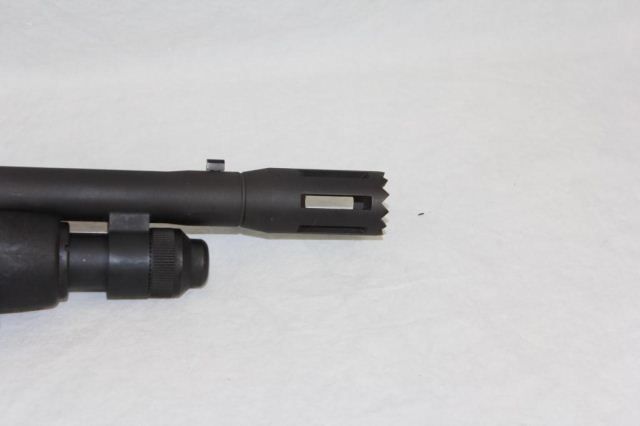 18-1/4" Barrel, 2-3/4" & 3" Chamber, Breacher Muzzle, All Black. Excellent Condition. Great Home Protection Gun.