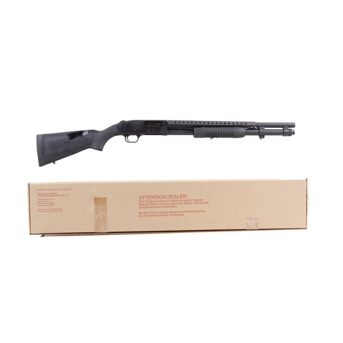 Mossberg 590A 12 ga, 3" SN:T161080 Pump action home defense/tactical shotgun with matte black finish, black synthetic stock with Speed Feed option, and ribbed pump handle, 21" barrel, for 3" shells, with heat shield, bayonet lug, and bead front sight.Pump action home defense/tactical shotgun with matte black finish, black synthetic stock with Speed Feed option, and ribbed pump handle, 21" barrel, for 3" shells, with heat shield, bayonet lug, and bead front sight.Good bore and action. Includes original box and manual. Nylon shell holder around the stock. Condition: Near new with no sign of use.