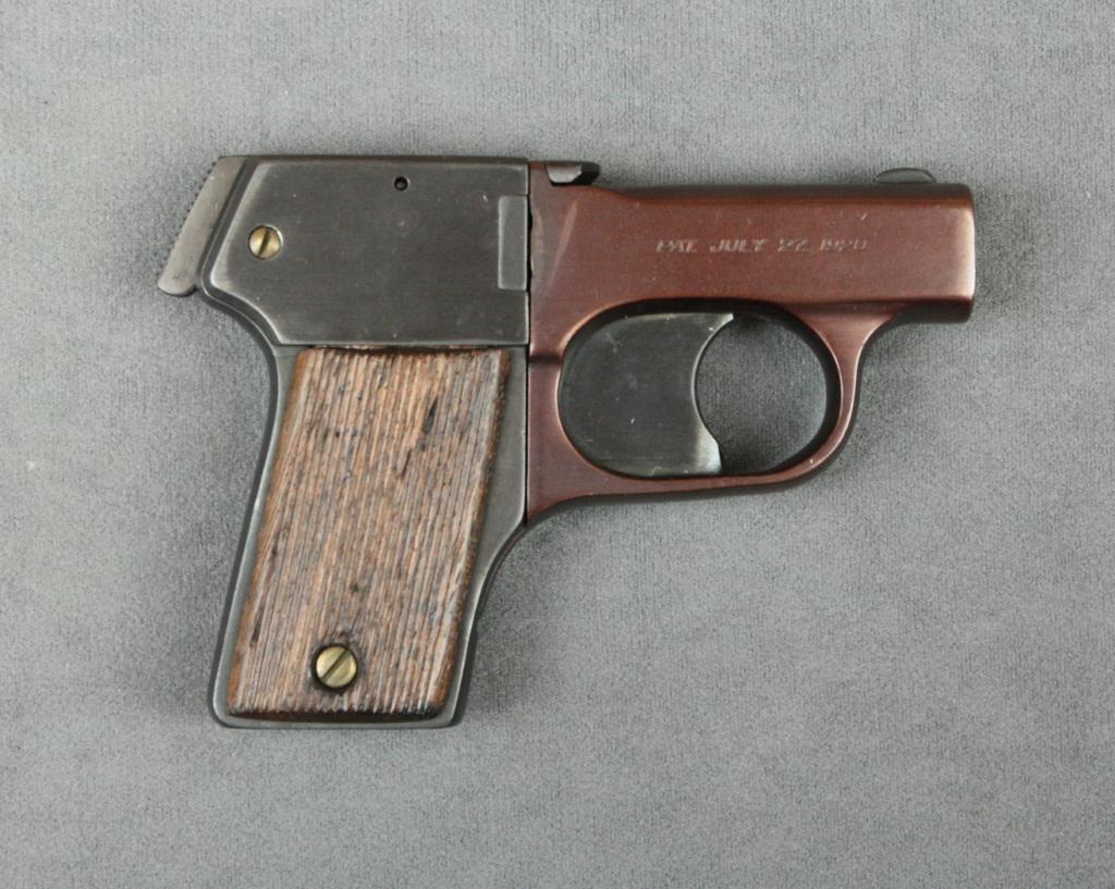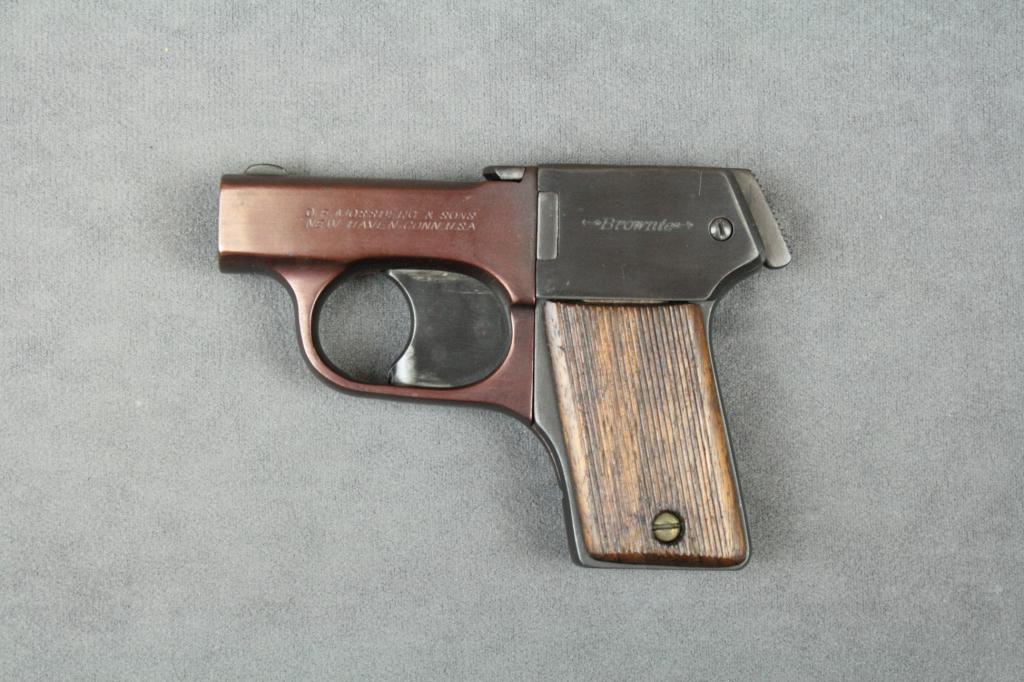 Mossberg Brownie Model four barrel derringer with rotating firing pin, .22 cal., 2-1/2” barrels, blue and bronze finish (blue on frame, bronze finish on barrel assembly), grooved wood grips, #18789. This gun is inoverall fair to good condition showing the majority of its finish, dark bores, good markings, good grips. Est.: $100-$200.