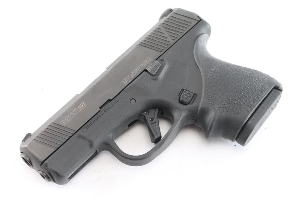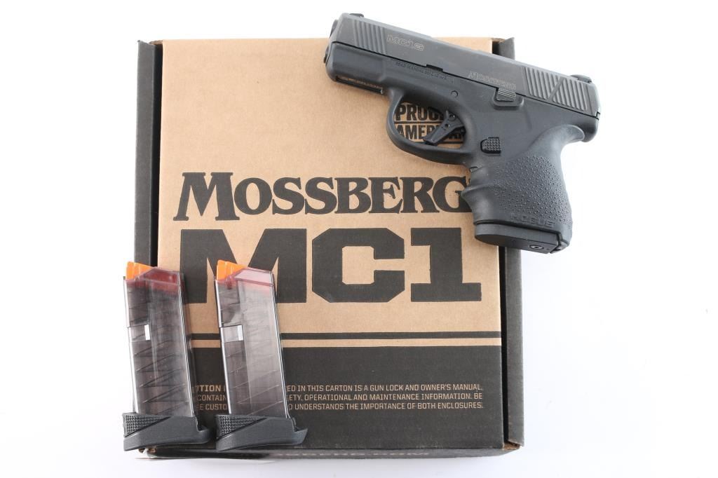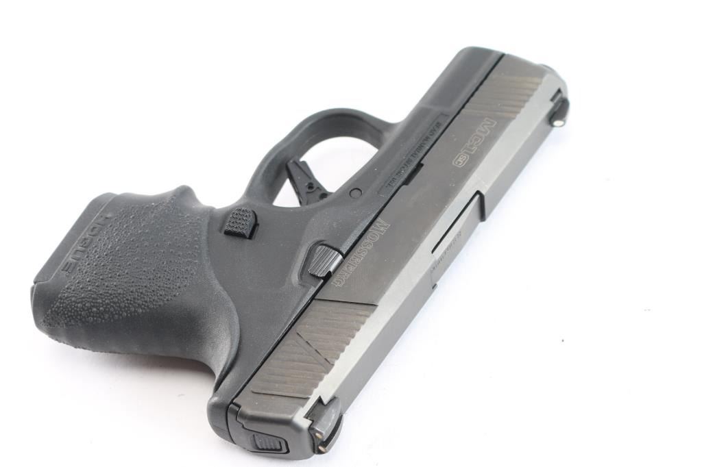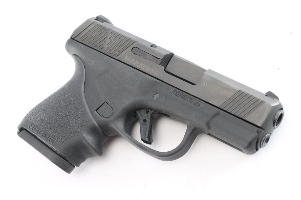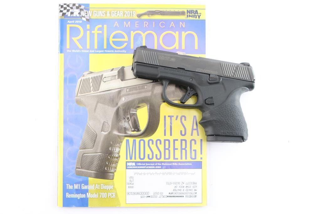 American made, semi-automatic subcompact pistol, approximately 3" barrel, bore is excellent/bright, three dot snag free sights, safety is in the flat trigger, single-stack, locked-breech, recoil-operated, striker-fired pistol with a molded polymer frame and a stainless steel slide, front and rear serrations on the slide, textured grips with palm swell, Hogue pebbled finger groove grip sleeve. Pistol exhibits nearly all of its original finish showing very little wear. Includes (2)extra seven-round magazines, (3) total, factory box with matching label, instruction manual and padlock with two keys. Also included is the April 2019 copy of the American Pistol featuring this pistol on the cover with accompanying article.