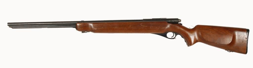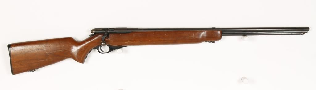 Bolt action rimfire rifle with 26" barrel. Blued finish, plain pistol grip wood stock, full length tube magazine, no sights and barrel and receiver have been dilled and tapped for optics. Good bore and action. Condition: Good showing scratches and dings from use. *Curio & Relic Firearm*
