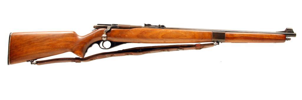 Mossberg Mdl 46m Cal .22S,L,LR SN:NVSN Bolt action repeater hunting rifle. Blued finish, smooth wood pistol grip full length stock, 23" barrel, good bore and action, adjustable rear sight. Condition: Good with finish thinning on the barrel. Leather sling.